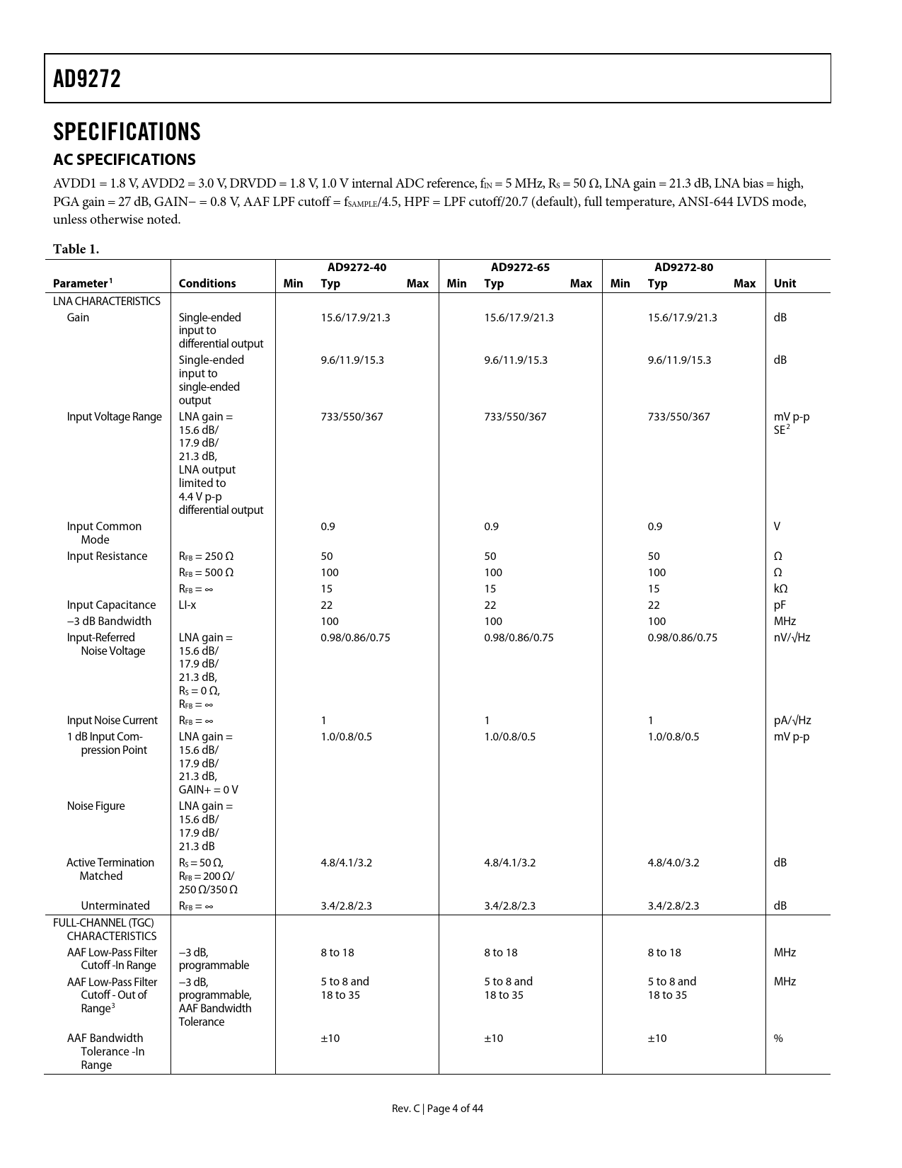AD9272. SPECIFICATIONS AC SPECIFICATIONS. Table 1. AD9272-40 AD9272-65 AD9272-80. Parameter1. Conditions. Min. Typ Max. Unit