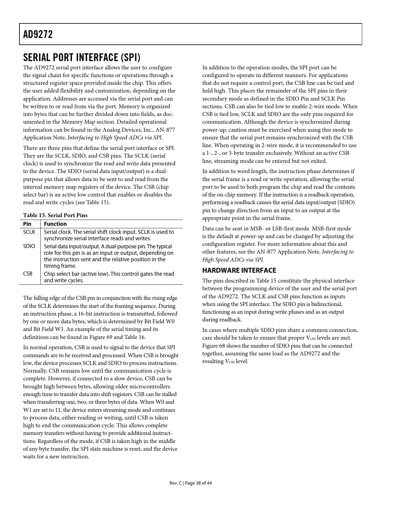 link to page 40 link to page 39 link to page 36 link to page 36 link to page 39 link to page 38 link to page 38 link to page 39 AD9272SERIAL PORT INTERFACE (SPI) The AD9272 serial port interface allows the user to configure In addition to the operation modes, the SPI port can be the signal chain for specific functions or operations through a configured to operate in different manners. For applications structured register space provided inside the chip. This offers that do not require a control port, the CSB line can be tied and the user added flexibility and customization, depending on the held high. This places the remainder of the SPI pins in their application. Addresses are accessed via the serial port and can secondary mode as defined in the SDIO Pin and SCLK Pin be written to or read from via the port. Memory is organized sections. CSB can also be tied low to enable 2-wire mode. When into bytes that can be further divided down into fields, as doc- CSB is tied low, SCLK and SDIO are the only pins required for umented in the Memory Map section. Detailed operational communication. Although the device is synchronized during information can be found in the Analog Devices, Inc., AN-877 power-up, caution must be exercised when using this mode to Application Note, Interfacing to High Speed ADCs via SPI. ensure that the serial port remains synchronized with the CSB There are three pins that define the serial port interface or SPI. line. When operating in 2-wire mode, it is recommended to use They are the SCLK, SDIO, and CSB pins. The SCLK (serial a 1-, 2-, or 3-byte transfer exclusively. Without an active CSB clock) is used to synchronize the read and write data presented line, streaming mode can be entered but not exited. to the device. The SDIO (serial data input/output) is a dual- In addition to word length, the instruction phase determines if purpose pin that allows data to be sent to and read from the the serial frame is a read or write operation, allowing the serial internal memory map registers of the device. The CSB (chip port to be used to both program the chip and read the contents select bar) is an active low control that enables or disables the of the on-chip memory. If the instruction is a readback operation, read and write cycles (see Table 15). performing a readback causes the serial data input/output (SDIO) pin to change direction from an input to an output at the Table 15. Serial Port Pins appropriate point in the serial frame. Pin Function Data can be sent in MSB- or LSB-first mode. MSB-first mode SCLK Serial clock. The serial shift clock input. SCLK is used to synchronize serial interface reads and writes. is the default at power-up and can be changed by adjusting the SDIO Serial data input/output. A dual-purpose pin. The typical configuration register. For more information about this and role for this pin is as an input or output, depending on other features, see the AN-877 Application Note, Interfacing to the instruction sent and the relative position in the High Speed ADCs via SPI. timing frame. HARDWARE INTERFACE CSB Chip select bar (active low). This control gates the read and write cycles. The pins described in Table 15 constitute the physical interface between the programming device of the user and the serial port The falling edge of the CSB pin in conjunction with the rising edge of the AD9272. The SCLK and CSB pins function as inputs of the SCLK determines the start of the framing sequence. During when using the SPI interface. The SDIO pin is bidirectional, an instruction phase, a 16-bit instruction is transmitted, followed functioning as an input during write phases and as an output by one or more data bytes, which is determined by Bit Field W0 during readback. and Bit Field W1. An example of the serial timing and its In cases where multiple SDIO pins share a common connection, definitions can be found in Figure 69 and Table 16. care should be taken to ensure that proper VOH levels are met. In normal operation, CSB is used to signal to the device that SPI Figure 68 shows the number of SDIO pins that can be connected commands are to be received and processed. When CSB is brought together, assuming the same load as the AD9272 and the low, the device processes SCLK and SDIO to process instructions. resulting VOH level. Normally, CSB remains low until the communication cycle is complete. However, if connected to a slow device, CSB can be brought high between bytes, allowing older microcontrollers enough time to transfer data into shift registers. CSB can be stalled when transferring one, two, or three bytes of data. When W0 and W1 are set to 11, the device enters streaming mode and continues to process data, either reading or writing, until CSB is taken high to end the communication cycle. This allows complete memory transfers without having to provide additional instruct- tions. Regardless of the mode, if CSB is taken high in the middle of any byte transfer, the SPI state machine is reset, and the device waits for a new instruction. Rev. C | Page 38 of 44 Document Outline FEATURES APPLICATIONS GENERAL DESCRIPTION FUNCTIONAL BLOCK DIAGRAM TABLE OF CONTENTS REVISION HISTORY PRODUCT HIGHLIGHTS SPECIFICATIONS AC SPECIFICATIONS DIGITAL SPECIFICATIONS SWITCHING SPECIFICATIONS ADC Timing Diagrams ABSOLUTE MAXIMUM RATINGS THERMAL IMPEDANCE ESD CAUTION PIN CONFIGURATION AND FUNCTION DESCRIPTIONS TYPICAL PERFORMANCE CHARACTERISTICS EQUIVALENT CIRCUITS THEORY OF OPERATION ULTRASOUND CHANNEL OVERVIEW Low Noise Amplifier (LNA) Recommendation Active Impedance Matching LNA Noise INPUT OVERDRIVE Input Overload Protection CW DOPPLER OPERATION Crosspoint Switch TGC OPERATION Variable Gain Amplifier Gain Control VGA Noise Antialiasing Filter ADC CLOCK INPUT CONSIDERATIONS Clock Duty Cycle Considerations Clock Jitter Considerations Power Dissipation and Power-Down Mode Digital Outputs and Timing SDIO Pin SCLK Pin CSB Pin RBIAS Pin Voltage Reference Power and Ground Recommendations Expo