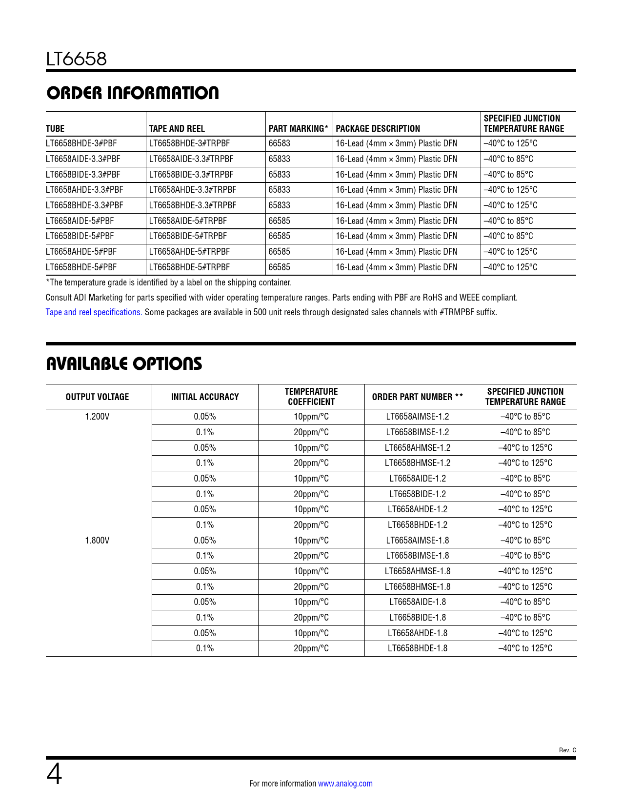 LT6658 ORDER INFORMATIONSPECIFIED JUNCTIONTUBETAPE AND REELPART MARKING* PACKAGE DESCRIPTIONTEMPERATURE RANGE LT6658BHDE-3#PBF LT6658BHDE-3#TRPBF 66583 16-Lead (4mm × 3mm) Plastic DFN –40°C to 125°C LT6658AIDE-3.3#PBF LT6658AIDE-3.3#TRPBF 65833 16-Lead (4mm × 3mm) Plastic DFN –40°C to 85°C LT6658BIDE-3.3#PBF LT6658BIDE-3.3#TRPBF 65833 16-Lead (4mm × 3mm) Plastic DFN –40°C to 85°C LT6658AHDE-3.3#PBF LT6658AHDE-3.3#TRPBF 65833 16-Lead (4mm × 3mm) Plastic DFN –40°C to 125°C LT6658BHDE-3.3#PBF LT6658BHDE-3.3#TRPBF 65833 16-Lead (4mm × 3mm) Plastic DFN –40°C to 125°C LT6658AIDE-5#PBF LT6658AIDE-5#TRPBF 66585 16-Lead (4mm × 3mm) Plastic DFN –40°C to 85°C LT6658BIDE-5#PBF LT6658BIDE-5#TRPBF 66585 16-Lead (4mm × 3mm) Plastic DFN –40°C to 85°C LT6658AHDE-5#PBF LT6658AHDE-5#TRPBF 66585 16-Lead (4mm × 3mm) Plastic DFN –40°C to 125°C LT6658BHDE-5#PBF LT6658BHDE-5#TRPBF 66585 16-Lead (4mm × 3mm) Plastic DFN –40°C to 125°C *The temperature grade is identified by a label on the shipping container. Consult ADI Marketing for parts specified with wider operating temperature ranges. Parts ending with PBF are RoHS and WEEE compliant. Tape and reel specifications. Some packages are available in 500 unit reels through designated sales channels with #TRMPBF suffix. AVAILABLE OPTIONSOUTPUT VOLTAGEINITIAL ACCURACYTEMPERATURECOEFFICIENTORDER PART NUMBER **SPECIFIED JUNCTIONTEMPERATURE RANGE 1.200V 0.05% 10ppm/°C LT6658AIMSE-1.2 –40°C to 85°C 0.1% 20ppm/°C LT6658BIMSE-1.2 –40°C to 85°C 0.05% 10ppm/°C LT6658AHMSE-1.2 –40°C to 125°C 0.1% 20ppm/°C LT6658BHMSE-1.2 –40°C to 125°C 0.05% 10ppm/°C LT6658AIDE-1.2 –40°C to 85°C 0.1% 20ppm/°C LT6658BIDE-1.2 –40°C to 85°C 0.05% 10ppm/°C LT6658AHDE-1.2 –40°C to 125°C 0.1% 20ppm/°C LT6658BHDE-1.2 –40°C to 125°C 1.800V 0.05% 10ppm/°C LT6658AIMSE-1.8 –40°C to 85°C 0.1% 20ppm/°C LT6658BIMSE-1.8 –40°C to 85°C 0.05% 10ppm/°C LT6658AHMSE-1.8 –40°C to 125°C 0.1% 20ppm/°C LT6658BHMSE-1.8 –40°C to 125°C 0.05% 10ppm/°C LT6658AIDE-1.8 –40°C to 85°C 0.1% 20ppm/°C LT6658BIDE-1.8 –40°C to 85°C 0.05% 10ppm/°C LT6658AHDE-1.8 –40°C to 125°C 0.1% 20ppm/°C LT6658BHDE-1.8 –40°C to 125°C Rev. C 4 For more information www.analog.com Document Outline Features Applications Typical Application Description Absolute Maximum Ratings Pin Configuration Order Information Available Options Electrical Characteristics Typical Performance Characteristics Pin Functions Block Diagram Applications Information Typical Applications Package Description Revision History Typical Application Related Parts