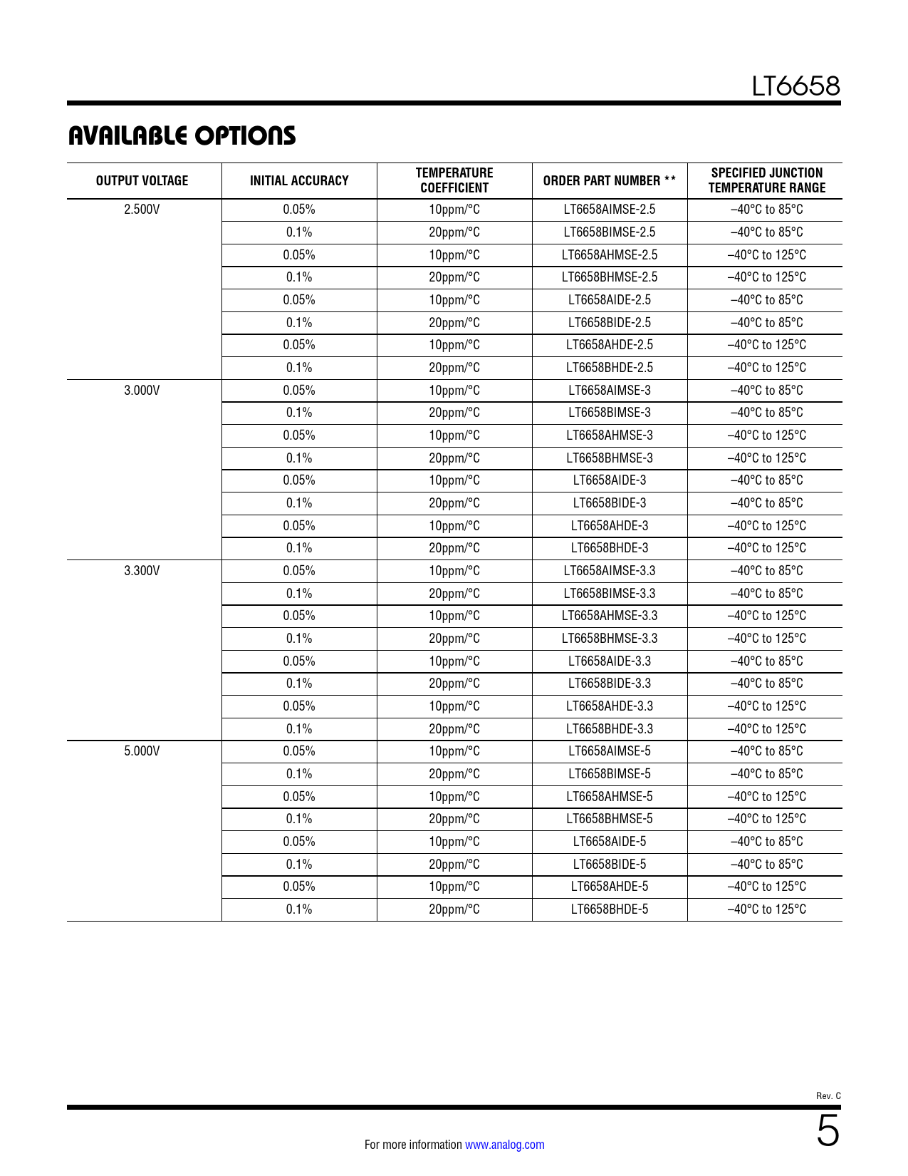 2.500V 0.05% 10ppm/°C LT6658AIMSE-2.5 –40°C to 85°C 0.1% 20ppm/°C LT6658BIMSE-2.5 –40°C to 85°C 0.05% 10ppm/°C LT6658AHMSE-2.5 –40°C to 125°C 0.1% 20ppm/°C LT6658BHMSE-2.5 –40°C to 125°C 0.05% 10ppm/°C LT6658AIDE-2.5 –40°C to 85°C 0.1% 20ppm/°C LT6658BIDE-2.5 –40°C to 85°C 0.05% 10ppm/°C LT6658AHDE-2.5 –40°C to 125°C 0.1% 20ppm/°C LT6658BHDE-2.5 –40°C to 125°C 3.000V 0.05% 10ppm/°C LT6658AIMSE-3 –40°C to 85°C 0.1% 20ppm/°C LT6658BIMSE-3 –40°C to 85°C 0.05% 10ppm/°C LT6658AHMSE-3 –40°C to 125°C 0.1% 20ppm/°C LT6658BHMSE-3 –40°C to 125°C 0.05% 10ppm/°C LT6658AIDE-3 –40°C to 85°C 0.1% 20ppm/°C LT6658BIDE-3 –40°C to 85°C 0.05% 10ppm/°C LT6658AHDE-3 –40°C to 125°C 0.1% 20ppm/°C LT6658BHDE-3 –40°C to 125°C 3.300V 0.05% 10ppm/°C LT6658AIMSE-3.3 –40°C to 85°C 0.1% 20ppm/°C LT6658BIMSE-3.3 –40°C to 85°C 0.05% 10ppm/°C LT6658AHMSE-3.3 –40°C to 125°C 0.1% 20ppm/°C LT6658BHMSE-3.3 –40°C to 125°C 0.05% 10ppm/°C LT6658AIDE-3.3 –40°C to 85°C 0.1% 20ppm/°C LT6658BIDE-3.3 –40°C to 85°C 0.05% 10ppm/°C LT6658AHDE-3.3 –40°C to 125°C 0.1% 20ppm/°C LT6658BHDE-3.3 –40°C to 125°C 5.000V 0.05% 10ppm/°C LT6658AIMSE-5 –40°C to 85°C 0.1% 20ppm/°C LT6658BIMSE-5 –40°C to 85°C 0.05% 10ppm/°C LT6658AHMSE-5 –40°C to 125°C 0.1% 20ppm/°C LT6658BHMSE-5 –40°C to 125°C 0.05% 10ppm/°C LT6658AIDE-5 –40°C to 85°C 0.1% 20ppm/°C LT6658BIDE-5 –40°C to 85°C 0.05% 10ppm/°C LT6658AHDE-5 –40°C to 125°C 0.1% 20ppm/°C LT6658BHDE-5 –40°C to 125°C Rev. C For more information www.analog.com 5 Document Outline Features Applications Typical Application Description Absolute Maximum Ratings Pin Configuration Order Information Available Options Electrical Characteristics Typical Performance Characteristics Pin Functions Block Diagram Applications Information Typical Applications Package Description Revision History Typical Application Related Parts