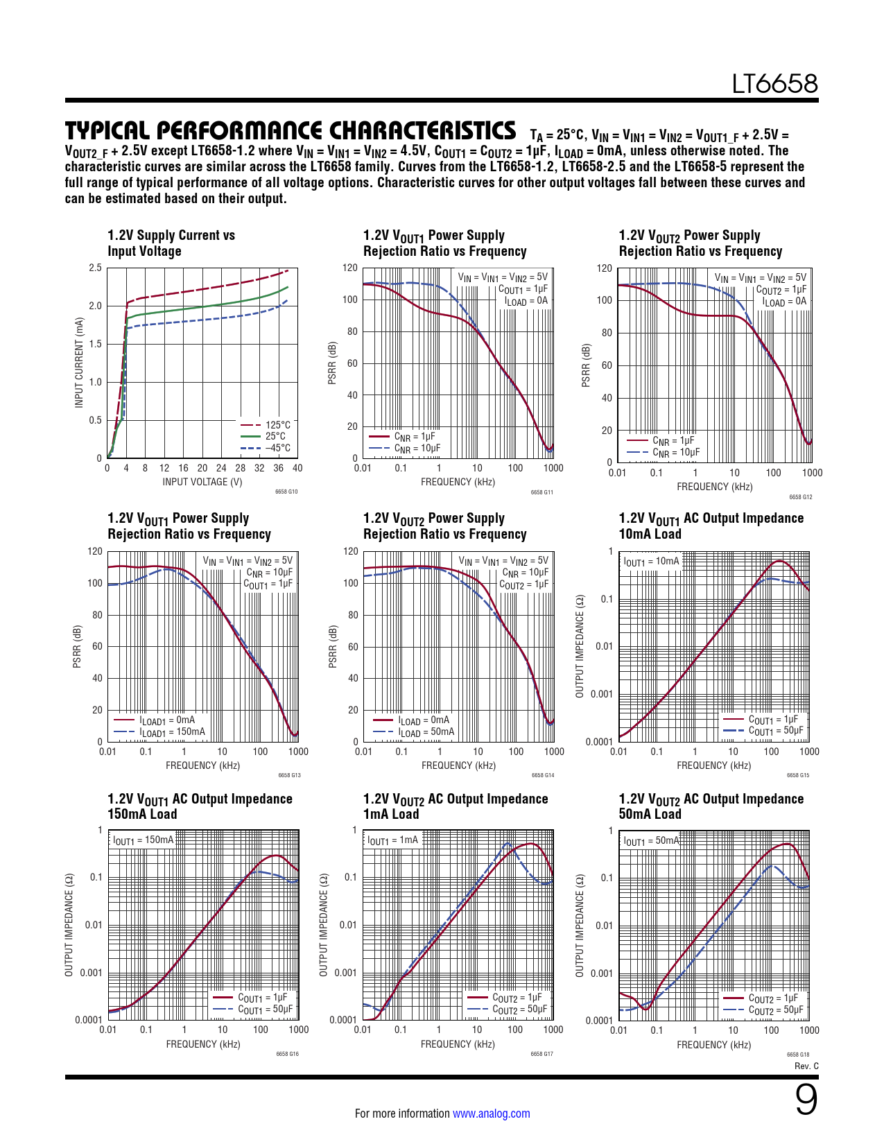 TYPICAL PERFORMANCE CHARACTERISTICS TA = 25°C, VIN = VIN1 = VIN2 = VOUT1_F + 2.5V = VOUT2_F + 2.5V except LT6658-1.2 where VIN = VIN1 = VIN2 = 4.5V, COUT1 = COUT2 = 1µF, ILOAD = 0mA, unless otherwise noted. The characteristic curves are similar across the LT6658 family. Curves from the LT6658-1.2, LT6658-2.5 and the LT6658-5 represent the full range of typical performance of all voltage options. Characteristic curves for other output voltages fall between these curves and can be estimated based on their output. 1.2V Supply Current vs 1.2V VOUT1 Power Supply 1.2V VOUT2 Power Supply Input Voltage Rejection Ratio vs Frequency Rejection Ratio vs Frequency