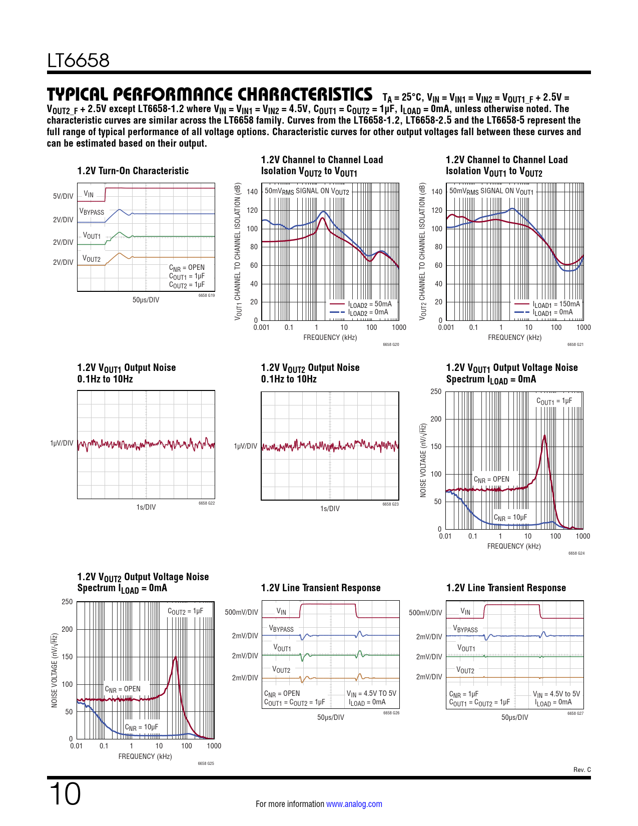 TYPICAL PERFORMANCE CHARACTERISTICS TA = 25°C, VIN = VIN1 = VIN2 = VOUT1_F + 2.5V = VOUT2_F + 2.5V except LT6658-1.2 where VIN = VIN1 = VIN2 = 4.5V, COUT1 = COUT2 = 1µF, ILOAD = 0mA, unless otherwise noted. The characteristic curves are similar across the LT6658 family. Curves from the LT6658-1.2, LT6658-2.5 and the LT6658-5 represent the full range of typical performance of all voltage options. Characteristic curves for other output voltages fall between these curves and can be estimated based on their output. 1.2V Channel to Channel Load 1.2V Channel to Channel Load 1.2V Turn-On Characteristic Isolation VOUT2 to VOUT1 Isolation VOUT1 to VOUT2