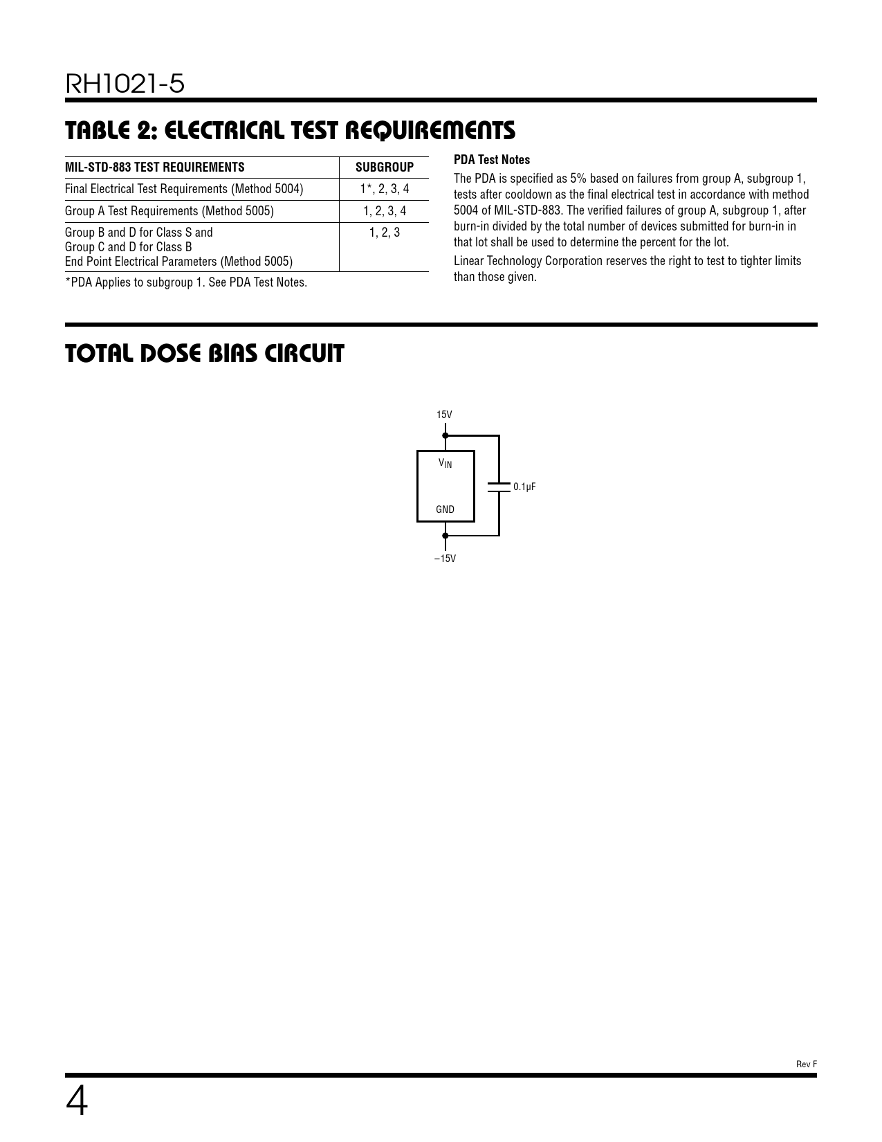 TABLE 2: ELECTRICAL TEST REQUIREMENTS MIL-STD-883 TEST REQUIREMENTS SUBGROUP PDA Test Notes TOTAL DOSE BIAS CIRCUIT
