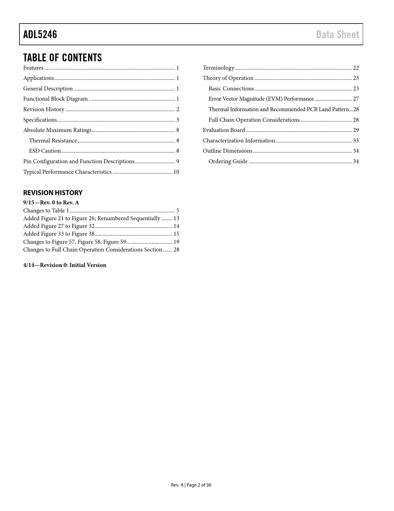 Páginas / Página36 / 2 — ADL5246. Data Sheet. TABLE OF CONTENTS. REVISION HISTORY. 9/15—Rev. 0 to …