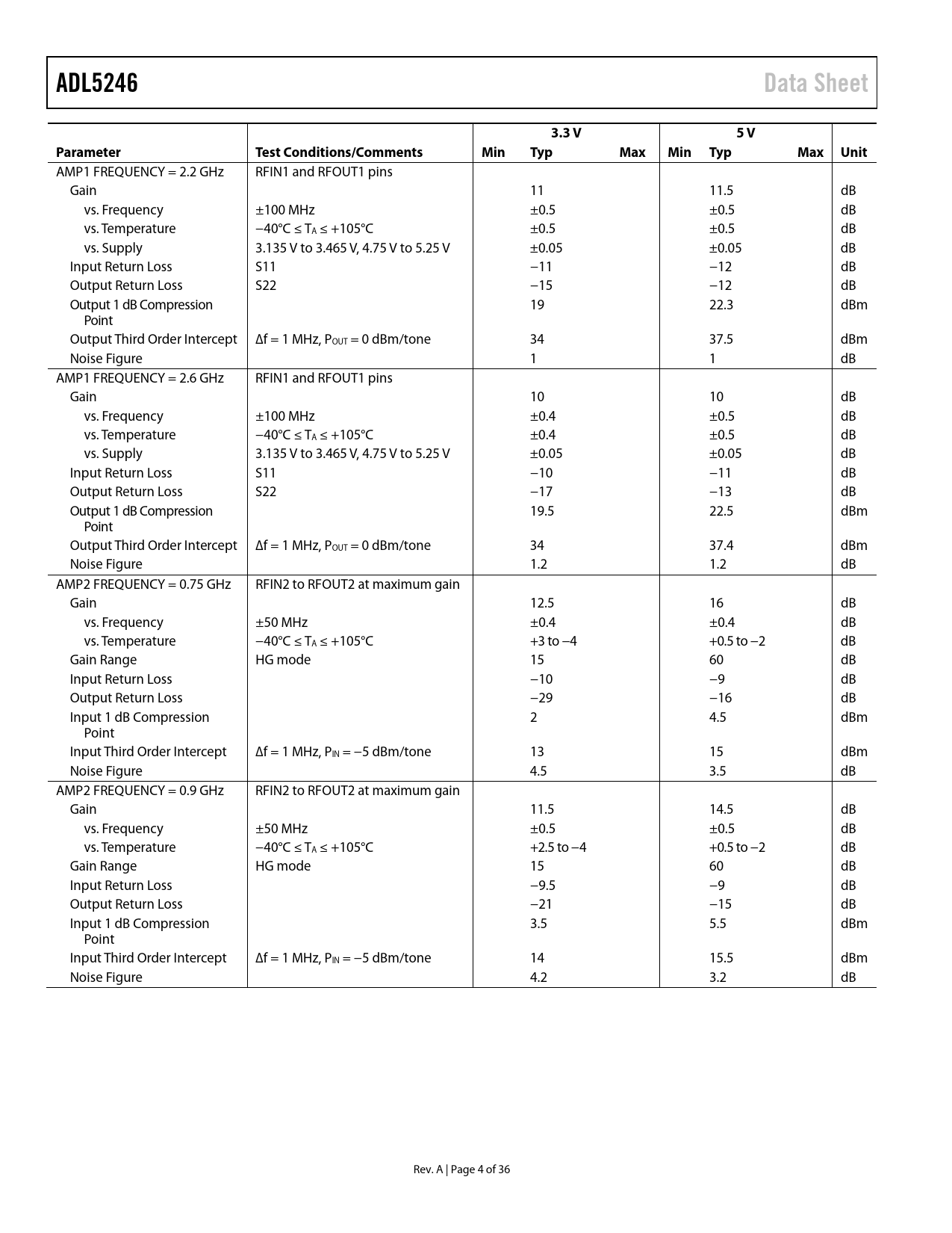 ADL5246Data Sheet3.3 V5 VParameterTest Conditions/CommentsMinTypMaxMin TypMax Unit AMP1 FREQUENCY = 2.2 GHz RFIN1 and RFOUT1 pins Gain 11 11.5 dB vs. Frequency ±100 MHz ±0.5 ±0.5 dB vs. Temperature −40°C ≤ TA ≤ +105°C ±0.5 ±0.5 dB vs. Supply 3.135 V to 3.465 V, 4.75 V to 5.25 V ±0.05 ±0.05 dB Input Return Loss S11 −11 −12 dB Output Return Loss S22 −15 −12 dB Output 1 dB Compression 19 22.3 dBm Point Output Third Order Intercept ∆f = 1 MHz, POUT = 0 dBm/tone 34 37.5 dBm Noise Figure 1 1 dB AMP1 FREQUENCY = 2.6 GHz RFIN1 and RFOUT1 pins Gain 10 10 dB vs. Frequency ±100 MHz ±0.4 ±0.5 dB vs. Temperature −40°C ≤ TA ≤ +105°C ±0.4 ±0.5 dB vs. Supply 3.135 V to 3.465 V, 4.75 V to 5.25 V ±0.05 ±0.05 dB Input Return Loss S11 −10 −11 dB Output Return Loss S22 −17 −13 dB Output 1 dB Compression 19.5 22.5 dBm Point Output Third Order Intercept ∆f = 1 MHz, POUT = 0 dBm/tone 34 37.4 dBm Noise Figure 1.2 1.2 dB AMP2 FREQUENCY = 0.75 GHz RFIN2 to RFOUT2 at maximum gain Gain 12.5 16 dB vs. Frequency ±50 MHz ±0.4 ±0.4 dB vs. Temperature −40°C ≤ TA ≤ +105°C +3 to −4 +0.5 to −2 dB Gain Range HG mode 15 60 dB Input Return Loss −10 −9 dB Output Return Loss −29 −16 dB Input 1 dB Compression 2 4.5 dBm Point Input Third Order Intercept ∆f = 1 MHz, PIN = −5 dBm/tone 13 15 dBm Noise Figure 4.5 3.5 dB AMP2 FREQUENCY = 0.9 GHz RFIN2 to RFOUT2 at maximum gain Gain 11.5 14.5 dB vs. Frequency ±50 MHz ±0.5 ±0.5 dB vs. Temperature −40°C ≤ TA ≤ +105°C +2.5 to −4 +0.5 to −2 dB Gain Range HG mode 15 60 dB Input Return Loss −9.5 −9 dB Output Return Loss −21 −15 dB Input 1 dB Compression 3.5 5.5 dBm Point Input Third Order Intercept ∆f = 1 MHz, PIN = −5 dBm/tone 14 15.5 dBm Noise Figure 4.2 3.2 dB Rev. A | Page 4 of 36 Document Outline FEATURES APPLICATIONS GENERAL DESCRIPTION FUNCTIONAL BLOCK DIAGRAM REVISION HISTORY SPECIFICATIONS ABSOLUTE MAXIMUM RATINGS THERMAL RESISTANCE ESD CAUTION PIN CONFIGURATION AND FUNCTION DESCRIPTIONS TYPICAL PERFORMANCE CHARACTERISTICS TERMINOLOGY THEORY OF OPERATION BASIC CONNECTIONS Amplifier 1 (AMP1) Amplifier 2 (AMP2) Amplifier 3 (AMP3) Gain Control Amplifier 3 Matching ERROR VECTOR MAGNITUDE (EVM) PERFORMANCE THERMAL INFORMATION AND RECOMMENDED PCB LAND PATTERN FULL CHAIN OPERATION CONSIDERATIONS EVALUATION BOARD CHARACTERIZATION INFORMATION OUTLINE DIMENSIONS ORDERING GUIDE