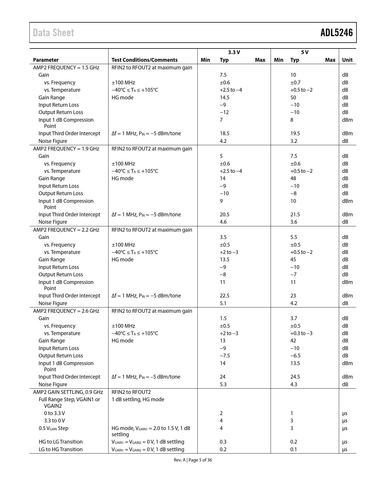 Data Sheet. ADL5246. 3.3 V. 5 V. Parameter. Test Conditions/Comments. Min. Typ. Max. Min Typ. Max Unit