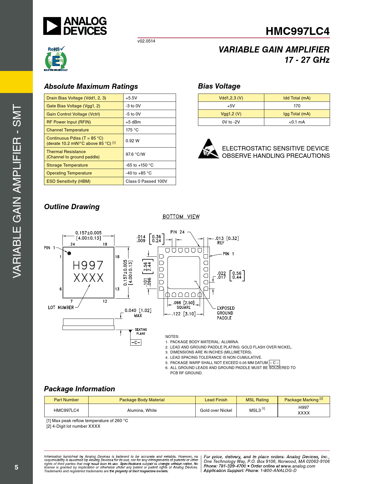 HMC997LC4. VARIABLE GAIN AMPLIFIER. 17 - 27 GHz. Absolute Maximum Ratings. Bias Voltage. Outline Drawing. Package Information