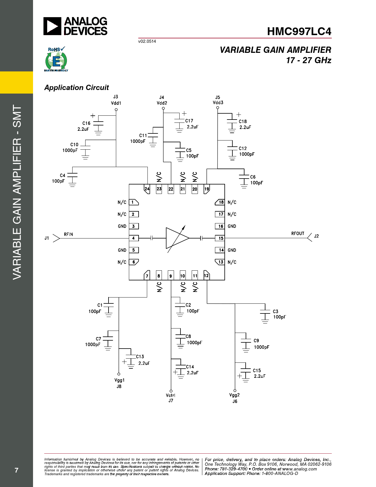 HMC997LC4 v02.0514 VARIABLE GAIN AMPLIFIER17 - 27 GHzApplication Circuit T m r - S ie lif p m a in a le G b ia r a V Inf F or o m r p atio r n ifc ur e n , d ishe e d lbiv y e A r n y a alog n D d t evic o p es is la beclie o eved rd to ebre sa: H ccur iattti e tae M nd re ilicarbloew . H a o ve C wever, o n rp o For price, delivery, and to place orders: Analog Devices, Inc., responsibility is assumed by Analog Devices for its use, nor for any infringements of patents or other oration, 2 Elizabeth Drive, Chelmsford, MA 01824 One Technology Way, P.O. Box 9106, Norwood, MA 02062-9106 Phone: 978-250-3343 Fax: 978-250-3373 O rights of third parties that may result from its use. Specifications subject to change without notice. No P rd hone e r O : 7 n 81- -3li 2n 9 e a -47 t w 0 w 0 • O w rd .h e it r o t niltie n .c e ao t m 7 license is granted by implication or otherwise under any patent or patent rights of Analog Devices. www.analog.com Application Support: Pho Trademarks and registered trademarks are the property of their respective owners. ne: 978-250-33 A 4 pp3li o ca rti a o pp n Susp@h portitti : P te ho .c neom : 1-800-ANALOG-D