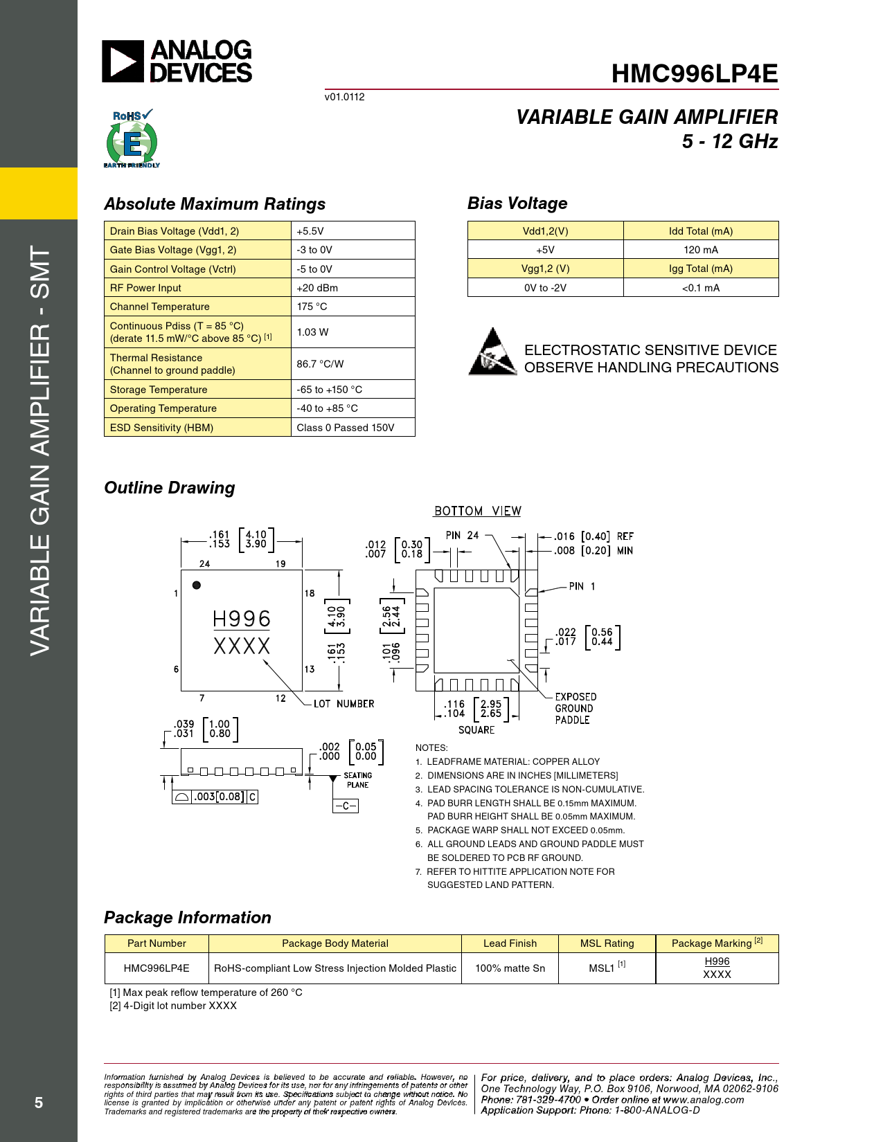HMC996LP4E. VARIABLE GAIN AMPLIFIER. 5 - 12 GHz. Absolute Maximum Ratings. Bias Voltage. Outline Drawing. Package Information