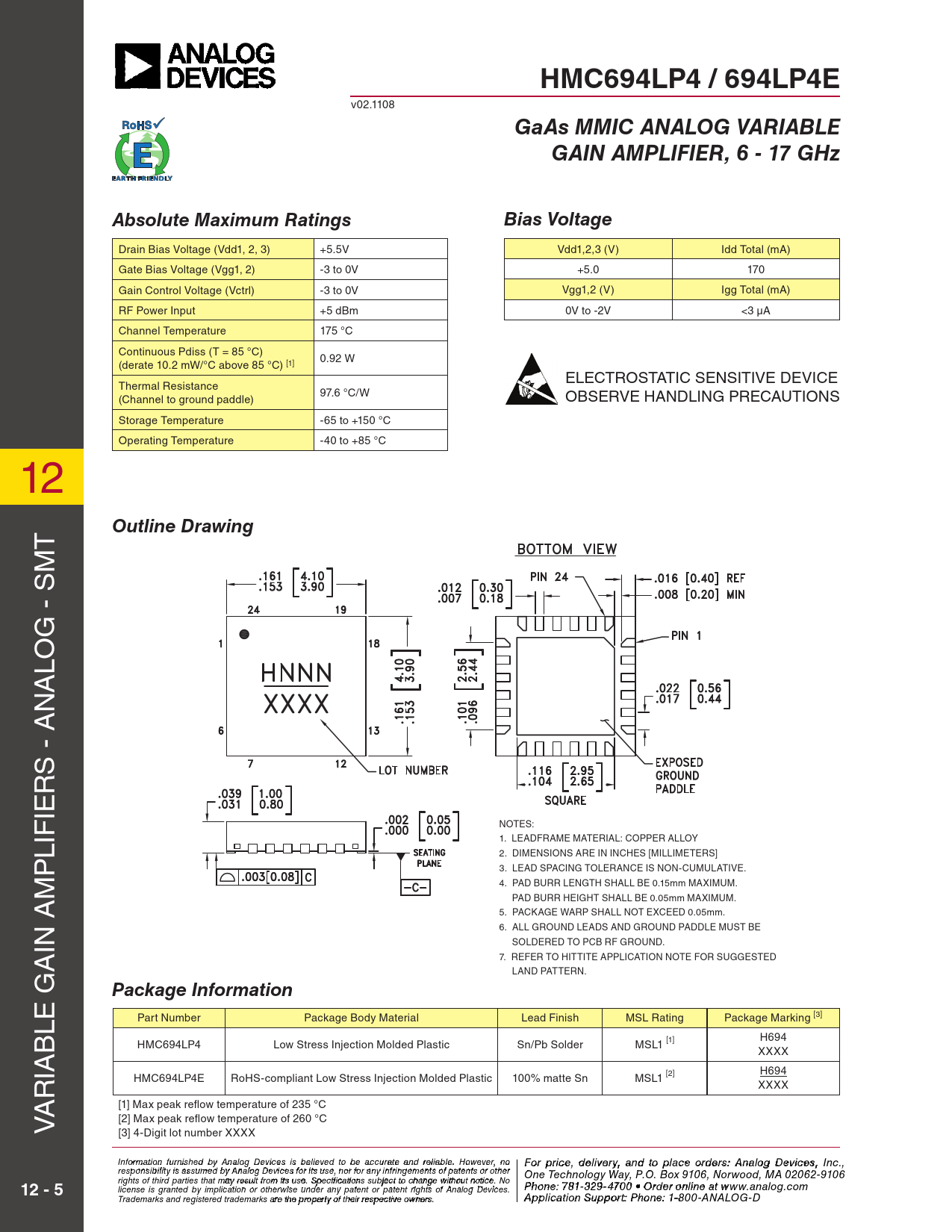 HMC694LP4 / 694LP4E. GaAs MMIC ANALOG VARIABLE. GAIN AMPLIFIER, 6 - 17 GHz. Absolute Maximum Ratings. Bias Voltage