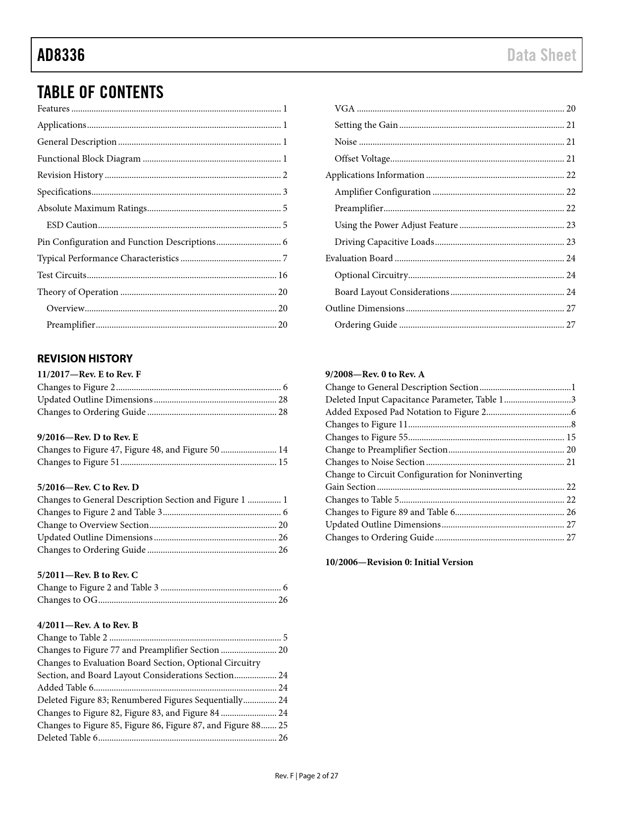 Páginas / Página27 / 2 — AD8336. Data Sheet. TABLE OF CONTENTS. REVISION HISTORY 11/2017—Rev. E to …
