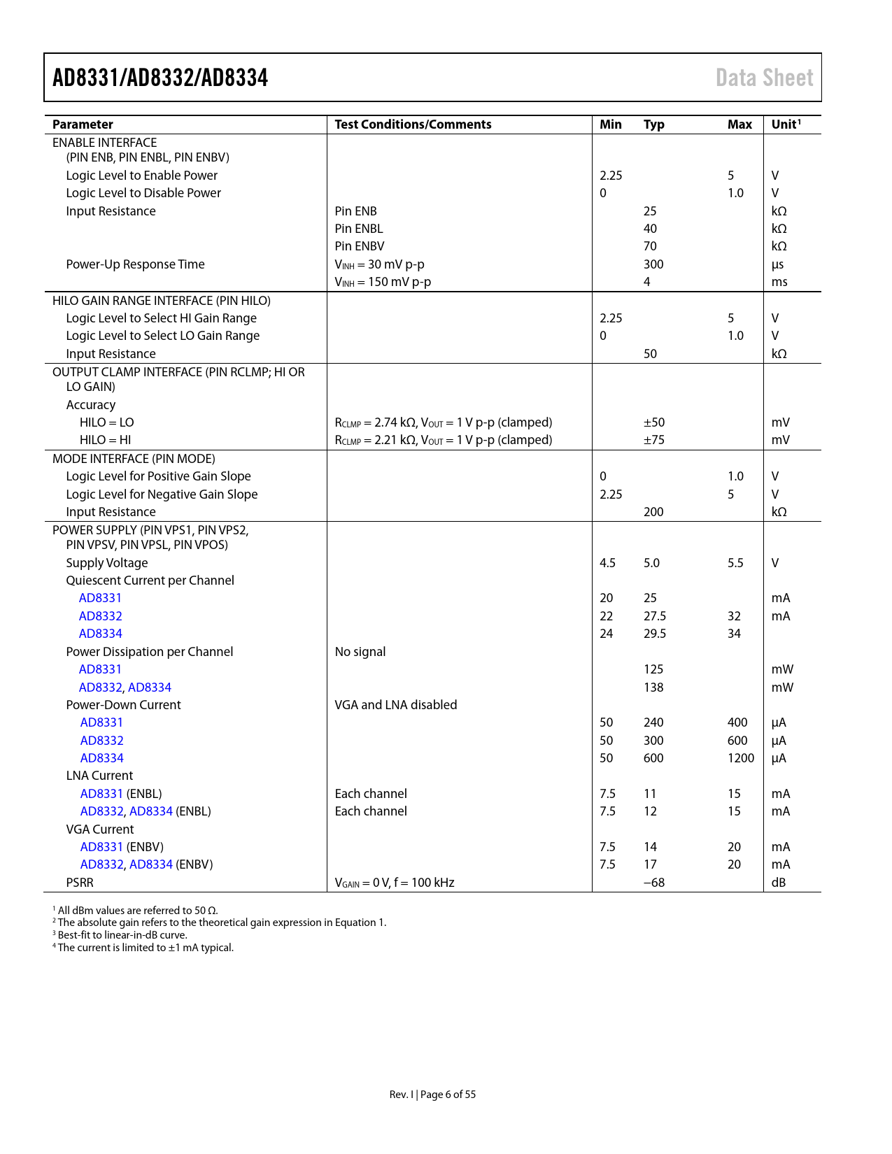 AD8331/AD8332/AD8334Data SheetParameterTest Conditions/CommentsMinTypMaxUnit1 ENABLE INTERFACE (PIN ENB, PIN ENBL, PIN ENBV) Logic Level to Enable Power 2.25 5 V Logic Level to Disable Power 0 1.0 V Input Resistance Pin ENB 25 kΩ Pin ENBL 40 kΩ Pin ENBV 70 kΩ Power-Up Response Time VINH = 30 mV p-p 300 µs VINH = 150 mV p-p 4 ms HILO GAIN RANGE INTERFACE (PIN HILO) Logic Level to Select HI Gain Range 2.25 5 V Logic Level to Select LO Gain Range 0 1.0 V Input Resistance 50 kΩ OUTPUT CLAMP INTERFACE (PIN RCLMP; HI OR LO GAIN) Accuracy HILO = LO RCLMP = 2.74 kΩ, VOUT = 1 V p-p (clamped) ±50 mV HILO = HI RCLMP = 2.21 kΩ, VOUT = 1 V p-p (clamped) ±75 mV MODE INTERFACE (PIN MODE) Logic Level for Positive Gain Slope 0 1.0 V Logic Level for Negative Gain Slope 2.25 5 V Input Resistance 200 kΩ POWER SUPPLY (PIN VPS1, PIN VPS2, PIN VPSV, PIN VPSL, PIN VPOS) Supply Voltage 4.5 5.0 5.5 V Quiescent Current per Channel AD8331 20 25 mA AD8332 22 27.5 32 mA AD8334 24 29.5 34 Power Dissipation per Channel No signal AD8331 125 mW AD8332, AD8334 138 mW Power-Down Current VGA and LNA disabled AD8331 50 240 400 µA AD8332 50 300 600 µA AD8334 50 600 1200 µA LNA Current AD8331 (ENBL) Each channel 7.5 11 15 mA AD8332, AD8334 (ENBL) Each channel 7.5 12 15 mA VGA Current AD8331 (ENBV) 7.5 14 20 mA AD8332, AD8334 (ENBV) 7.5 17 20 mA PSRR VGAIN = 0 V, f = 100 kHz −68 dB 1 All dBm values are referred to 50 Ω. 2 The absolute gain refers to the theoretical gain expression in Equation 1. 3 Best-fit to linear-in-dB curve. 4 The current is limited to ±1 mA typical. Rev. I | Page 6 of 55 Document Outline FEATURES APPLICATIONS GENERAL DESCRIPTION FUNCTIONAL BLOCK DIAGRAM TABLE OF CONTENTS REVISION HISTORY SPECIFICATIONS ABSOLUTE MAXIMUM RATINGS ESD CAUTION PIN CONFIGURATIONS AND FUNCTION DESCRIPTIONS TYPICAL PERFORMANCE CHARACTERISTICS TEST CIRCUITS MEASUREMENT CONSIDERATIONS THEORY OF OPERATION OVERVIEW LOW NOISE AMPLIFIER (LNA) Active Impedance Matching LNA Noise VARIABLE GAIN AMPLIFIER X-AMP VGA Gain Control VGA Noise Common-Mode Biasing POSTAMPLIFIER Noise Output Clamping APPLICATIONS INFORMATION LNA—EXTERNAL COMPONENTS Gain Input VCM Input Logic Inputs—ENB, MODE, and HILO Optional Output Voltage Limiting Output Decoupling DRIVING ADCs OVERLOAD OPTIONAL INPUT OVERLOAD PROTECTION LAYOUT, GROUNDING, AND BYPASSING MULTIPLE INPUT MATCHING DISABLING THE LNA ULTRASOUND TGC APPLICATION HIGH DENSITY QUAD LAYOUT AD8331 EVALUATION BOARD GENERAL DESCRIPTION USER-SUPPLIED OPTIONAL COMPONENTS MEASUREMENT SETUP BOARD LAYOUT AD8331 EVALUATION BOARD SCHEMATICS AD8331 EVALUATION BOARD PCB LAYERS AD8332 EVALUATION BOARD GENERAL DESCRIPTION USER-SUPPLIED OPTIONAL COMPONENTS MEASUREMENT SETUP BOARD LAYOUT EVALUATION BOARD SCHEMATICS AD8332 EVALUATION BOARD PCB LAYERS AD8334 EVALUATION BOARD GENERAL DESCRIPTION CONFIGURING THE INPUT IMPEDANCE Driving the VGA from an External Source or Using the LNA to Drive an External Load Using the Clamp Circuit Viewing Signals MEASUREMENT SETUP BOARD LAYOUT EVALUATION BOARD SCHEMATICS AD8334 EVALUATION BOARD PCB LAYERS OUTLINE DIMENSIONS ORDERING GUIDE