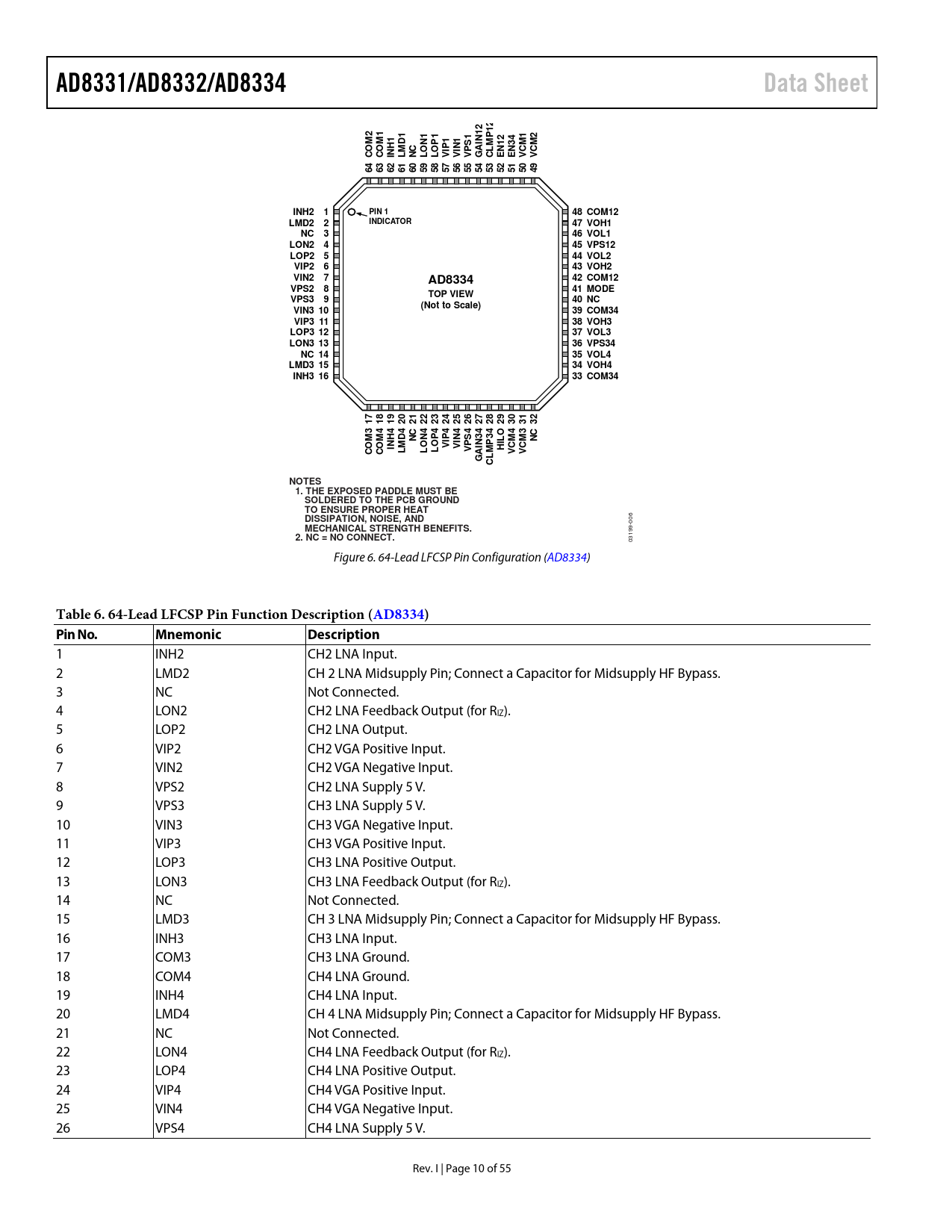 AD8331/AD8332/AD8334 Data Sheet 12 2 1 1 1 P M M D1 N12 M M1 M2 M P1 IN1 AI N12 N34 CO CO INH1 L NC LON LOP VI V VPS1 G CL E E VC VC 64 63 62 61 60 59 58 57 56 55 54 53 52 51 50 49 INH2 1 PIN 1 48 COM12 INDICATOR LMD2 2 47 VOH1 NC 3 46 VOL1 LON2 4 45 VPS12 LOP2 5 44 VOL2 VIP2 6 43 VOH2 VIN2 7 42 COM12 AD8334 VPS2 8 41 MODE TOP VIEW VPS3 9 40 NC (Not to Scale) VIN3 10 39 COM34 VIP3 11 38 VOH3 LOP3 12 37 VOL3 LON3 13 36 VPS34 NC 14 35 VOL4 LMD3 15 34 VOH4 INH3 16 33 COM34 17 18 19 20 21 22 23 24 25 26 27 28 29 30 31 32 3 4 4 4 M M D4 NC P4 IN4 34 P ILO M4 M3 NC INH4 M VI V N34 H CO CO L LON LOP VPS4 AI M VC VC G CL NOTES 1. THE EXPOSED PADDLE MUST BE SOLDERED TO THE PCB GROUND TO ENSURE PROPER HEAT DISSIPATION, NOISE, AND