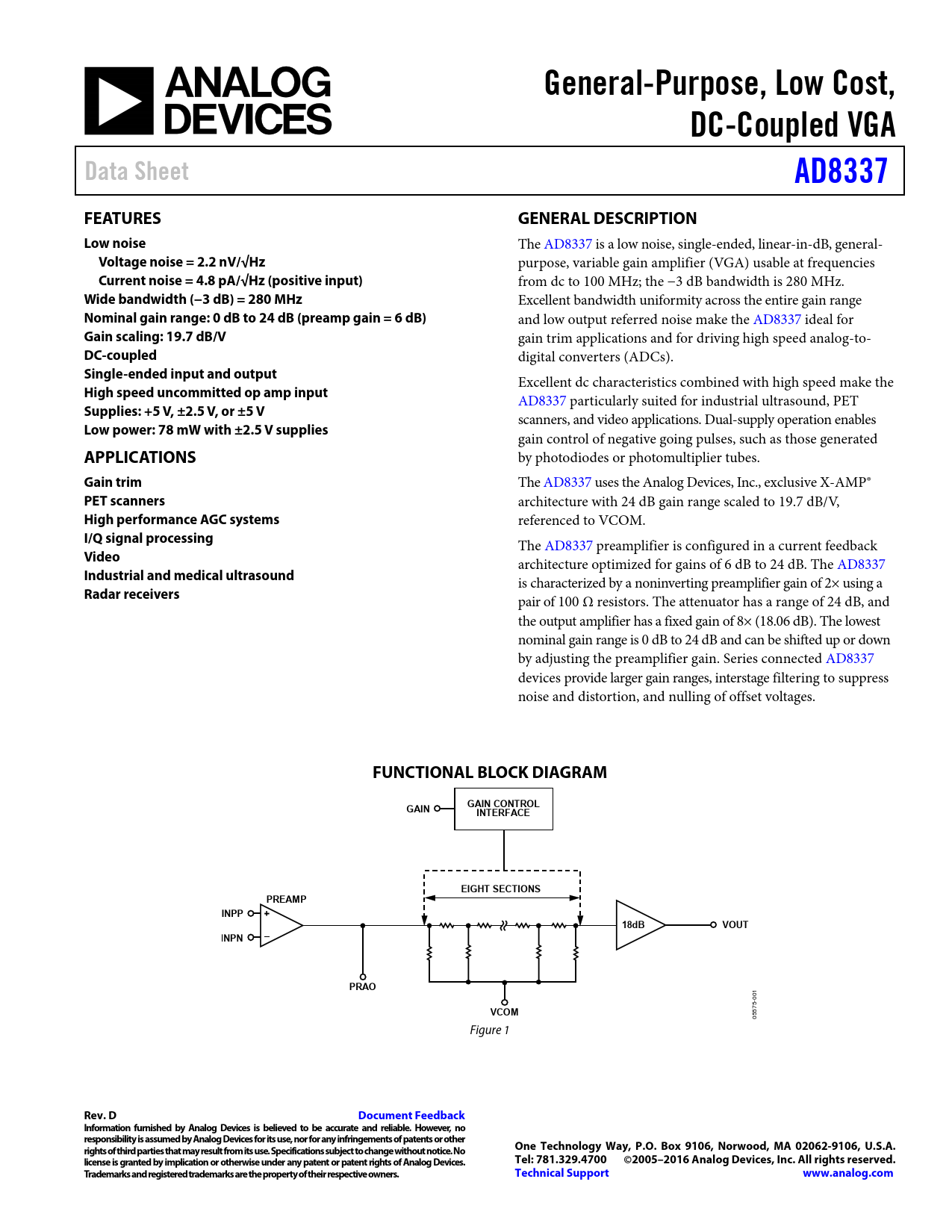 General-Purpose, Low Cost,. DC-Coupled VGA. Data Sheet. AD8337. FEATURES. GENERAL DESCRIPTION. Low noise. Voltage noise = 2.2 nV/√Hz