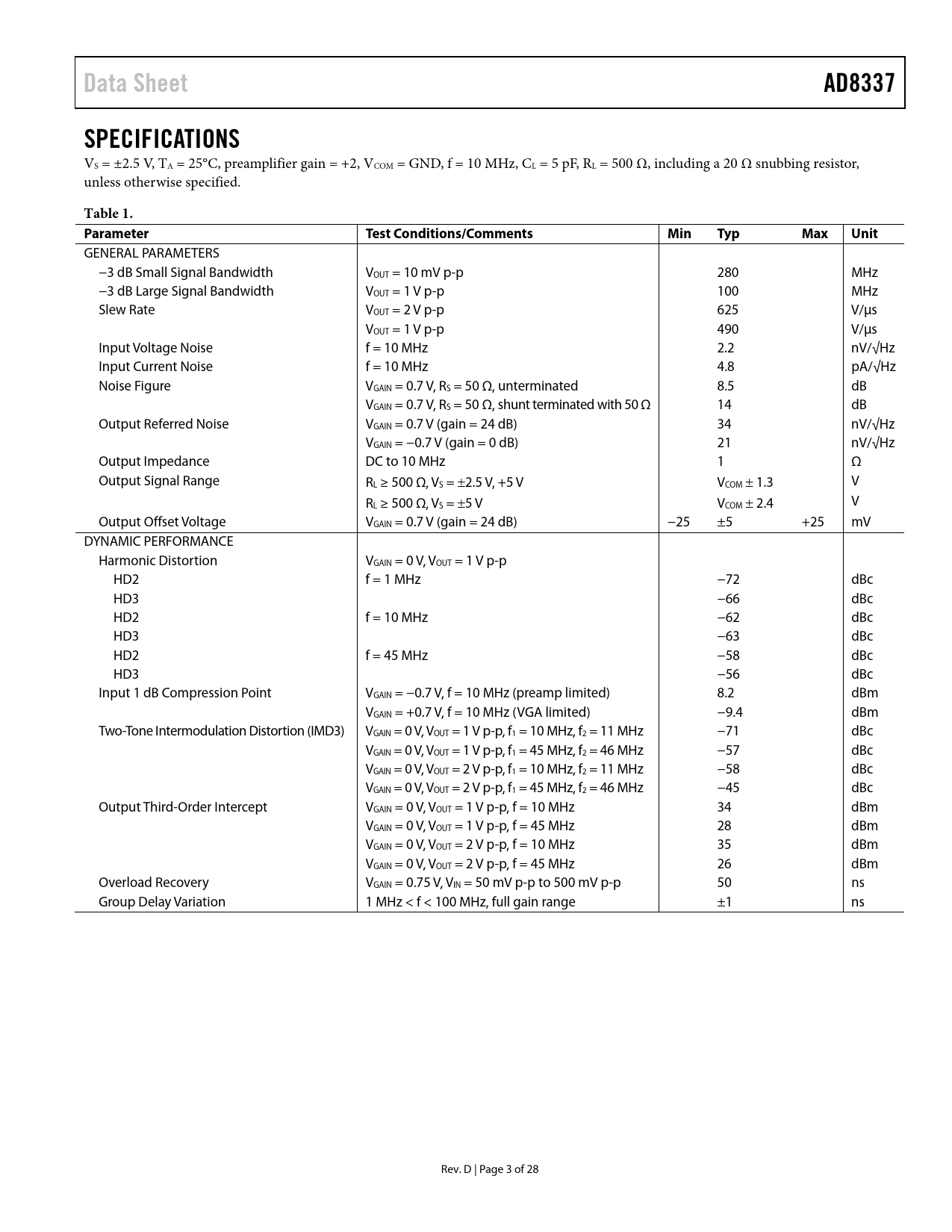 Data Sheet AD8337 SPECIFICATIONS