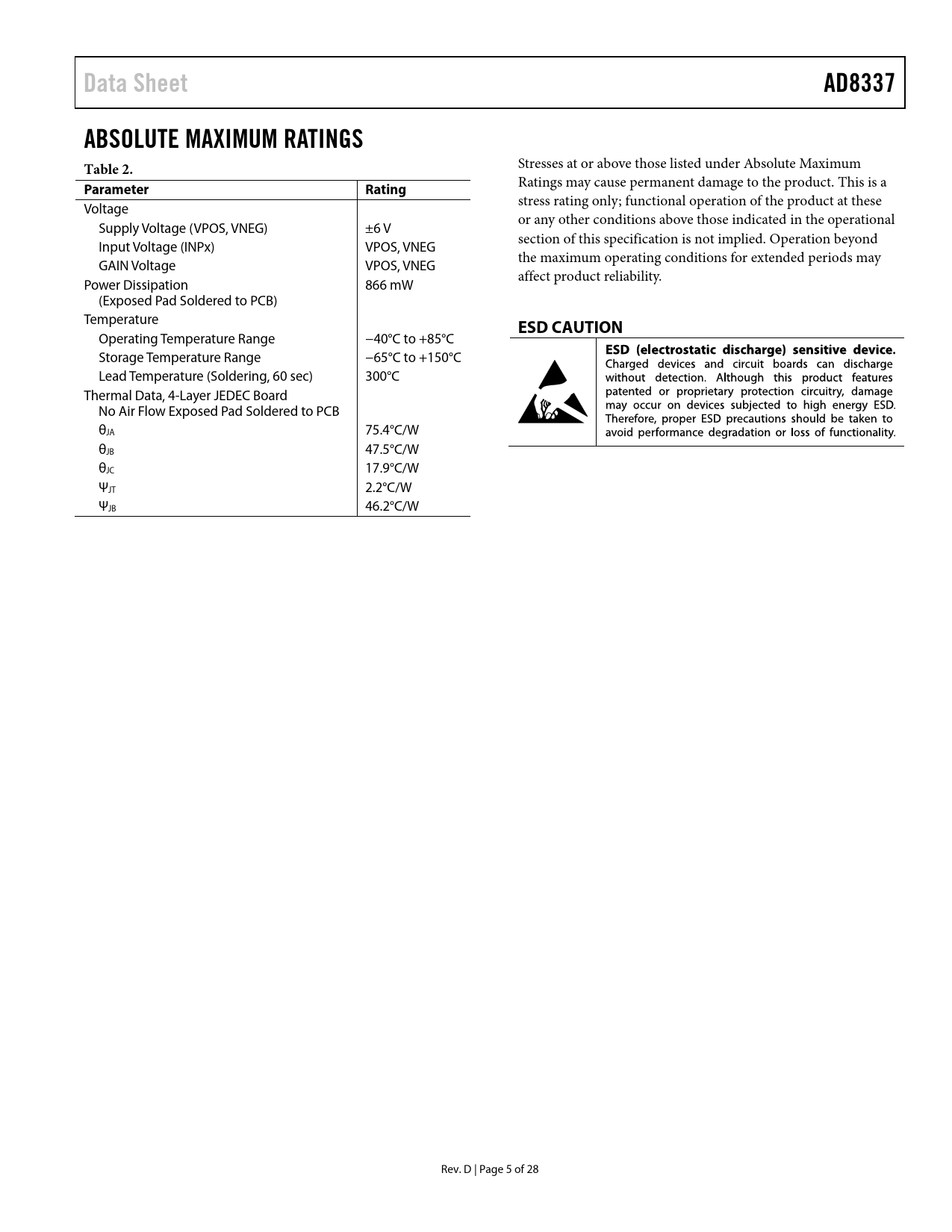 Data Sheet AD8337 ABSOLUTE MAXIMUM RATINGS Table 2 Parameter Rating ESD CAUTION