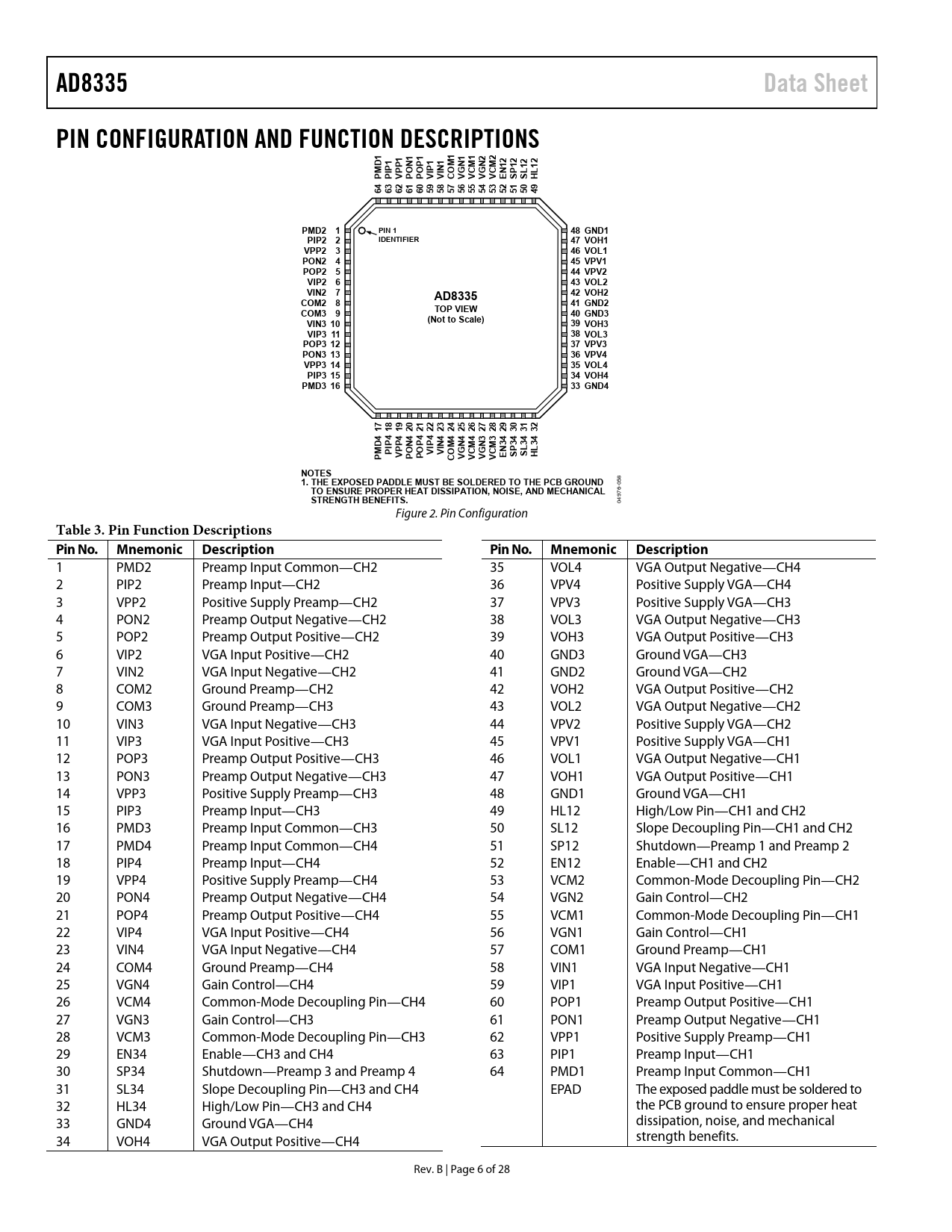 | Páginas / Página | 28 / 6 — AD8335. Data Sheet. PIN CONFIGURATION AND FUNCTION DESCRIPTIONS. PMD. … |