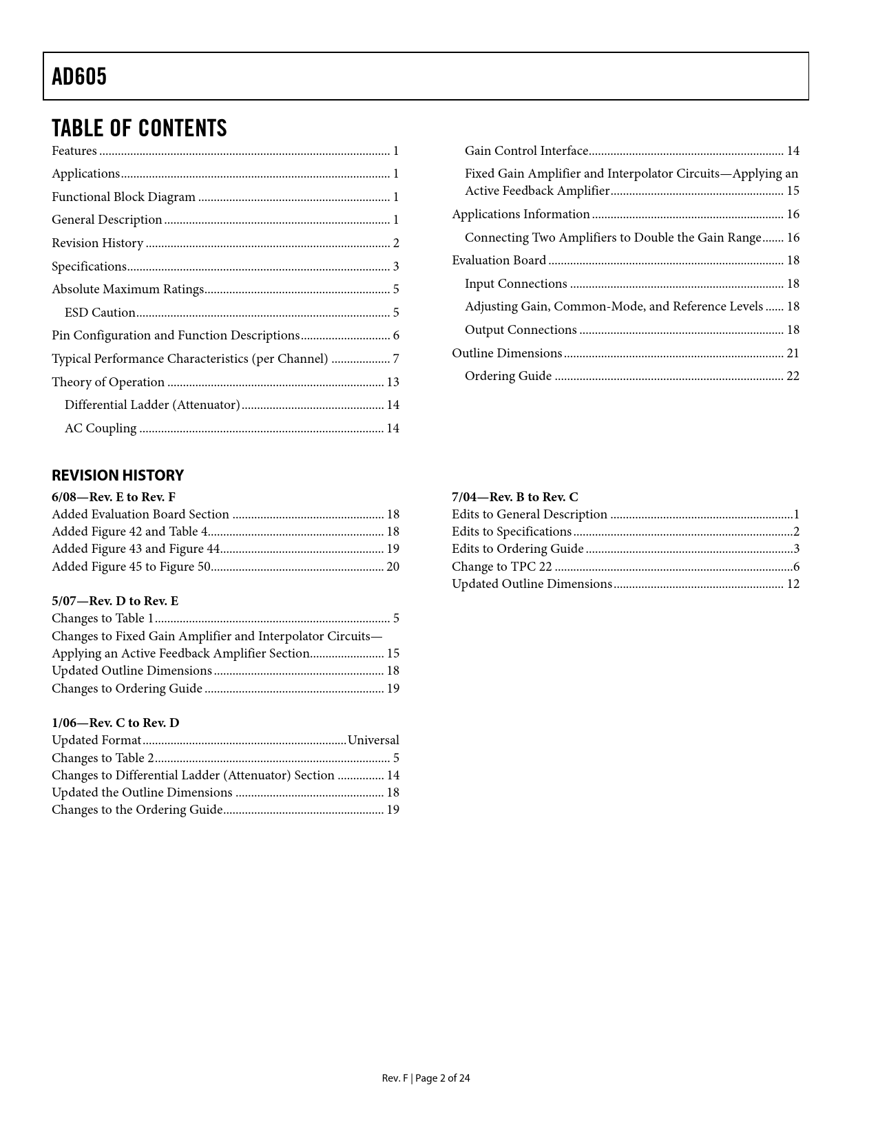 link to page 1 link to page 1 link to page 1 link to page 1 link to page 1 link to page 1 link to page 1 link to page 1 link to page 2 link to page 2 link to page 3 link to page 3 link to page 5 link to page 5 link to page 5 link to page 5 link to page 6 link to page 6 link to page 7 link to page 7 link to page 13 link to page 13 link to page 14 link to page 14 link to page 14 link to page 14 link to page 14 link to page 14 link to page 15 link to page 15 link to page 15 link to page 16 link to page 16 link to page 16 link to page 16 link to page 18 link to page 18 link to page 18 link to page 18 link to page 18 link to page 18 link to page 18 link to page 18 link to page 21 link to page 21 link to page 22 link to page 22 AD605TABLE OF CONTENTS Features .. 1 Gain Control Interface ... 14 Applications ... 1 Fixed Gain Amplifier and Interpolator Circuits—Applying an Functional Block Diagram .. 1 Active Feedback Amplifier .. 15 General Description ... 1 Applications Information .. 16 Revision History ... 2 Connecting Two Amplifiers to Double the Gain Range ... 16 Specifications ... 3 Evaluation Board .. 18 Absolute Maximum Ratings .. 5 Input Connections ... 18 ESD Caution .. 5 Adjusting Gain, Common-Mode, and Reference Levels .. 18 Pin Configuration and Function Descriptions ... 6 Output Connections .. 18 Typical Performance Characteristics (per Channel) ... 7 Outline Dimensions ... 21 Theory of Operation .. 13 Ordering Guide .. 22 Differential Ladder (Attenuator) .. 14 AC Coupling ... 14 REVISION HISTORY6/08—Rev. E to Rev. F7/04—Rev. B to Rev. C Added Evaluation Board Section ... 18 Edits to General Description ... 1 Added Figure 42 and Table 4... 18 Edits to Specifications ... 2 Added Figure 43 and Figure 44... 19 Edits to Ordering Guide ... 3 Added Figure 45 to Figure 50 .. 20 Change to TPC 22 ... 6 Updated Outline Dimensions ... 12 5/07—Rev. D to Rev. E Changes to Table 1 .. 5 Changes to Fixed Gain Amplifier and Interpolator Circuits— Applying an Active Feedback Amplifier Section .. 15 Updated Outline Dimensions ... 18 Changes to Ordering Guide .. 19 1/06—Rev. C to Rev. D Updated Format .. Universal Changes to Table 2 .. 5 Changes to Differential Ladder (Attenuator) Section ... 14 Updated the Outline Dimensions .. 18 Changes to the Ordering Guide .. 19 Rev. F | Page 2 of 24 Document Outline FEATURES APPLICATIONS FUNCTIONAL BLOCK DIAGRAM GENERAL DESCRIPTION TABLE OF CONTENTS REVISION HISTORY SPECIFICATIONS ABSOLUTE MAXIMUM RATINGS ESD CAUTION PIN CONFIGURATION AND FUNCTION DESCRIPTIONS TYPICAL PERFORMANCE CHARACTERISTICS (PER CHANNEL) THEORY OF OPERATION DIFFERENTIAL LADDER (ATTENUATOR) AC COUPLING GAIN CONTROL INTERFACE FIXED GAIN AMPLIFIER AND INTERPOLATOR CIRCUITS—APPLYING AN ACTIVE FEEDBACK AMPLIFIER APPLICATIONS INFORMATION CONNECTING TWO AMPLIFIERS TO DOUBLE THE GAIN RANGE EVALUATION BOARD INPUT CONNECTIONS ADJUSTING GAIN, COMMON-MODE, AND REFERENCE LEVELS OUTPUT CONNECTIONS OUTLINE DIMENSIONS ORDERING GUIDE