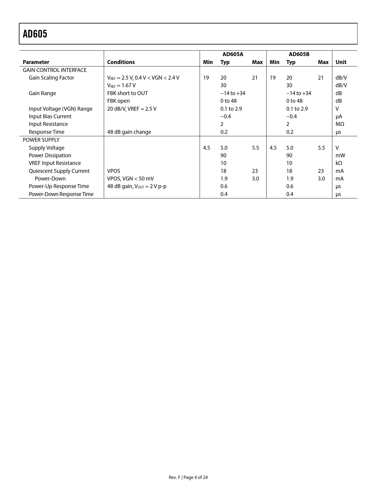 AD605AD605AAD605BParameterConditionsMin TypMax Min TypMax Unit GAIN CONTROL INTERFACE Gain Scaling Factor VREF = 2.5 V, 0.4 V < VGN < 2.4 V 19 20 21 19 20 21 dB/V VREF = 1.67 V 30 30 dB/V Gain Range FBK short to OUT −14 to +34 −14 to +34 dB FBK open 0 to 48 0 to 48 dB Input Voltage (VGN) Range 20 dB/V, VREF = 2.5 V 0.1 to 2.9 0.1 to 2.9 V Input Bias Current −0.4 −0.4 μA Input Resistance 2 2 MΩ Response Time 48 dB gain change 0.2 0.2 μs POWER SUPPLY Supply Voltage 4.5 5.0 5.5 4.5 5.0 5.5 V Power Dissipation 90 90 mW VREF Input Resistance 10 10 kΩ Quiescent Supply Current VPOS 18 23 18 23 mA Power-Down VPOS, VGN < 50 mV 1.9 3.0 1.9 3.0 mA Power-Up Response Time 48 dB gain, VOUT = 2 V p-p 0.6 0.6 μs Power-Down Response Time 0.4 0.4 μs Rev. F | Page 4 of 24 Document Outline FEATURES APPLICATIONS FUNCTIONAL BLOCK DIAGRAM GENERAL DESCRIPTION TABLE OF CONTENTS REVISION HISTORY SPECIFICATIONS ABSOLUTE MAXIMUM RATINGS ESD CAUTION PIN CONFIGURATION AND FUNCTION DESCRIPTIONS TYPICAL PERFORMANCE CHARACTERISTICS (PER CHANNEL) THEORY OF OPERATION DIFFERENTIAL LADDER (ATTENUATOR) AC COUPLING GAIN CONTROL INTERFACE FIXED GAIN AMPLIFIER AND INTERPOLATOR CIRCUITS—APPLYING AN ACTIVE FEEDBACK AMPLIFIER APPLICATIONS INFORMATION CONNECTING TWO AMPLIFIERS TO DOUBLE THE GAIN RANGE EVALUATION BOARD INPUT CONNECTIONS ADJUSTING GAIN, COMMON-MODE, AND REFERENCE LEVELS OUTPUT CONNECTIONS OUTLINE DIMENSIONS ORDERING GUIDE