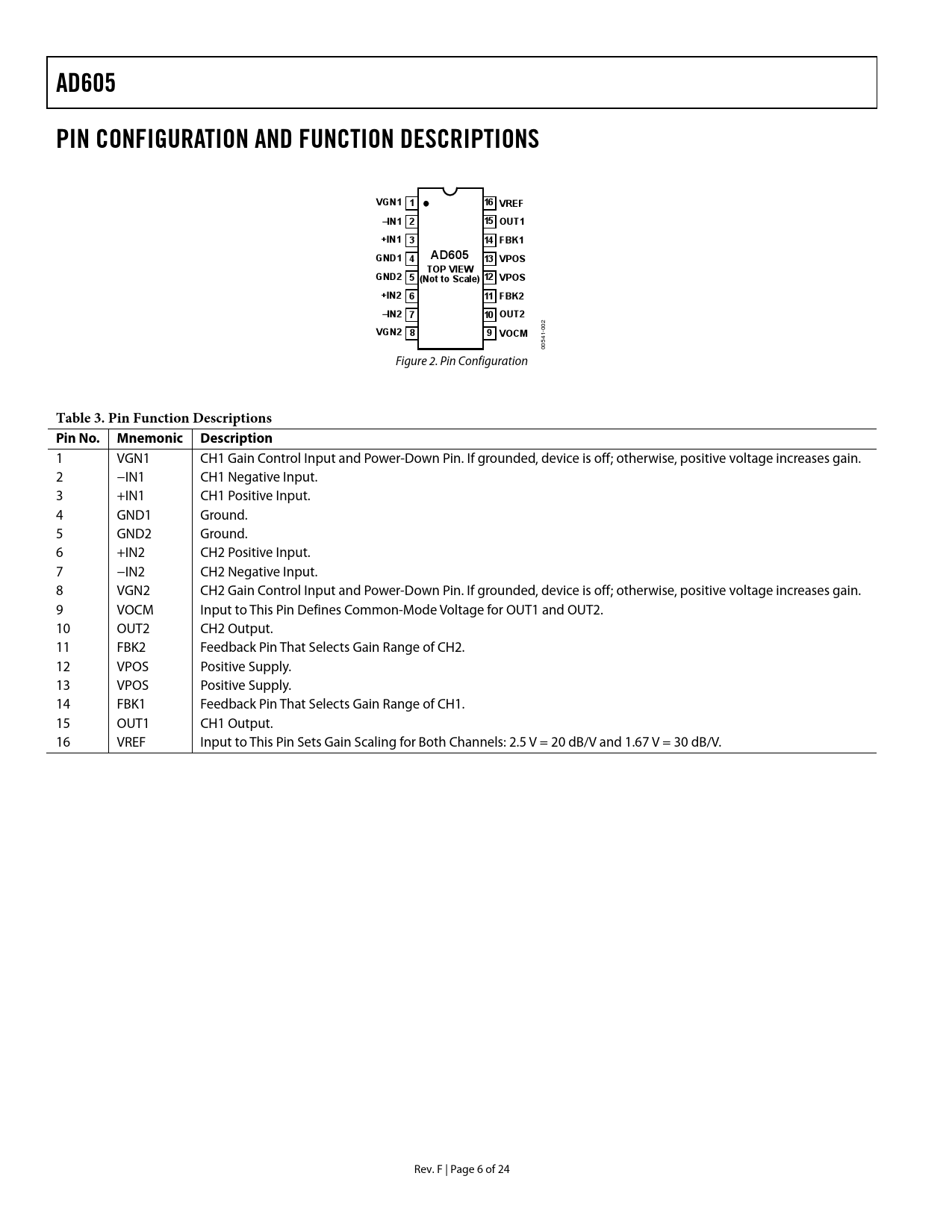 AD605. PIN CONFIGURATION AND FUNCTION DESCRIPTIONS. VGN1 1. 16 VREF. –IN1 2. 15 OUT1. +IN1 3. 14 FBK1. GND1 4. 13 VPOS. TOP VIEW. GND2 5