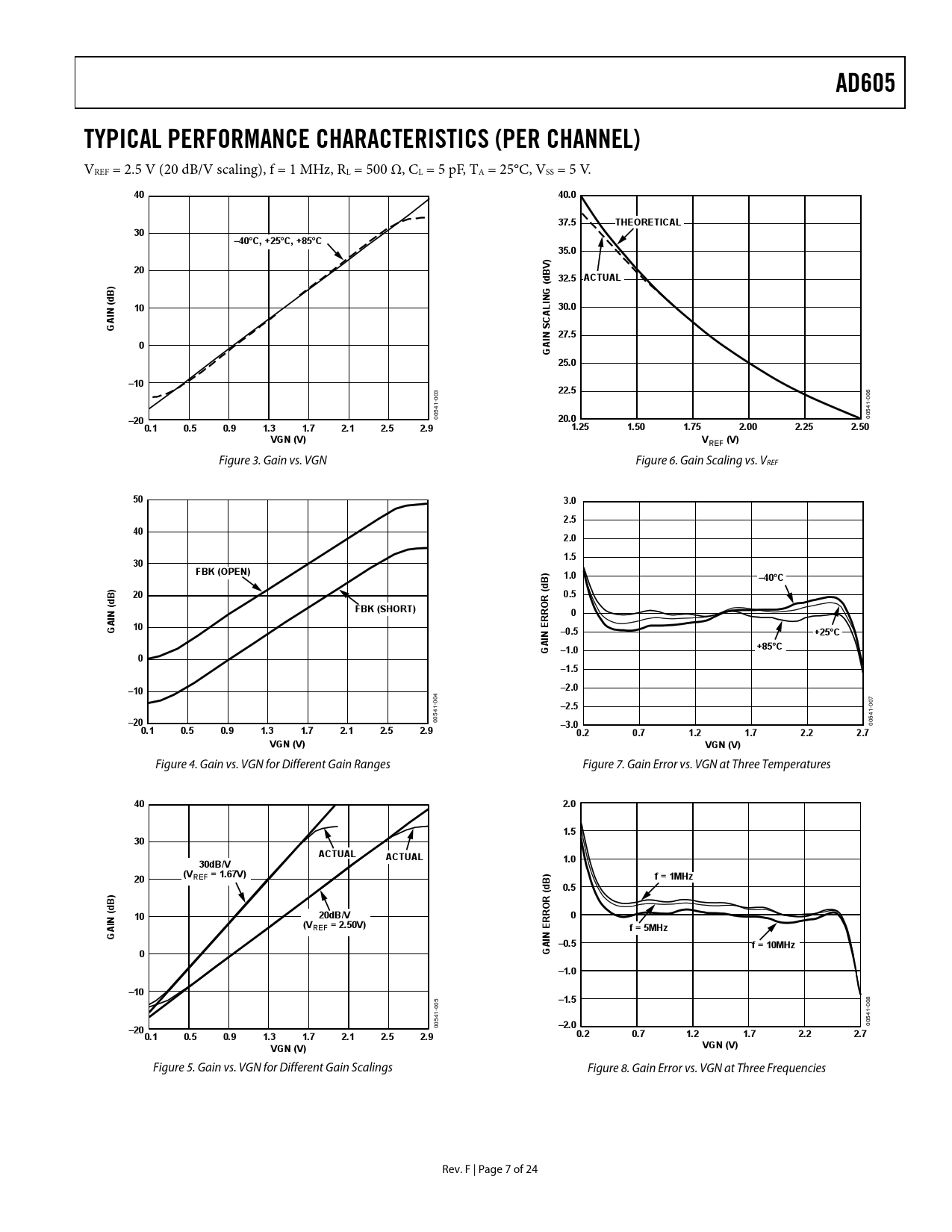 AD605TYPICAL PERFORMANCE CHARACTERISTICS (PER CHANNEL) VREF = 2.5 V (20 dB/V scaling), f = 1 MHz, RL = 500 Ω, CL = 5 pF, TA = 25°C, VSS = 5 V. 4040.037.5THEORETICAL30–40°C, +25°C, +85°C35.0)20V B d 32.5 ACTUAL)(BGd (IN10L 30.0INA CGAS IN 27.50GA25.0–10 3 22.5 06 00 0 1- 1- 54 54 –20 00 20.0 00 0.10.50.91.31.72.12.52.91.251.501.752.002.252.50VGN (V)VREF (V) Figure 3. Gain vs. VGN Figure 6. Gain Scaling vs. VREF 503.02.5402.01.530FBK (OPEN)B)1.0–40°C)dB200.5dR ((FBK (SHORT)INRO0RGA10N E–0.5+25°CAI G–1.0+85°C0–1.5–10–2.0 04 0 07 1- –2.5 0 1- 54 54 –20 00 –3.0 00 0.10.50.91.31.72.12.52.90.20.71.21.72.22.7VGN (V)VGN (V) Figure 4. Gain vs. VGN for Different Gain Ranges Figure 7. Gain Error vs. VGN at Three Temperatures 402.01.530ACTUALACTUAL30dB/V1.0(VREF = 1.67V)20B)f = 1MHzd0.5) BR (dO(1020dB/V0INRR(VREF = 2.50V)f = 5MHzGAN E AI –0.5f = 10MHz0G–1.0–10 5 –1.5 08 00 0 1- 1- 54 54 –2.0 00 –20 00 0.10.50.91.31.72.12.52.90.20.71.21.72.22.7VGN (V)VGN (V) Figure 5. Gain vs. VGN for Different Gain Scalings Figure 8. Gain Error vs. VGN at Three Frequencies Rev. F | Page 7 of 24 Document Outline FEATURES APPLICATIONS FUNCTIONAL BLOCK DIAGRAM GENERAL DESCRIPTION TABLE OF CONTENTS REVISION HISTORY SPECIFICATIONS ABSOLUTE MAXIMUM RATINGS ESD CAUTION PIN CONFIGURATION AND FUNCTION DESCRIPTIONS TYPICAL PERFORMANCE CHARACTERISTICS (PER CHANNEL) THEORY OF OPERATION DIFFERENTIAL LADDER (ATTENUATOR) AC COUPLING GAIN CONTROL INTERFACE FIXED GAIN AMPLIFIER AND INTERPOLATOR CIRCUITS—APPLYING AN ACTIVE FEEDBACK AMPLIFIER APPLICATIONS INFORMATION CONNECTING TWO AMPLIFIERS TO DOUBLE THE GAIN RANGE EVALUATION BOARD INPUT CONNECTIONS ADJUSTING GAIN, COMMON-MODE, AND REFERENCE LEVELS OUTPUT CONNECTIONS OUTLINE DIMENSIONS ORDERING GUIDE