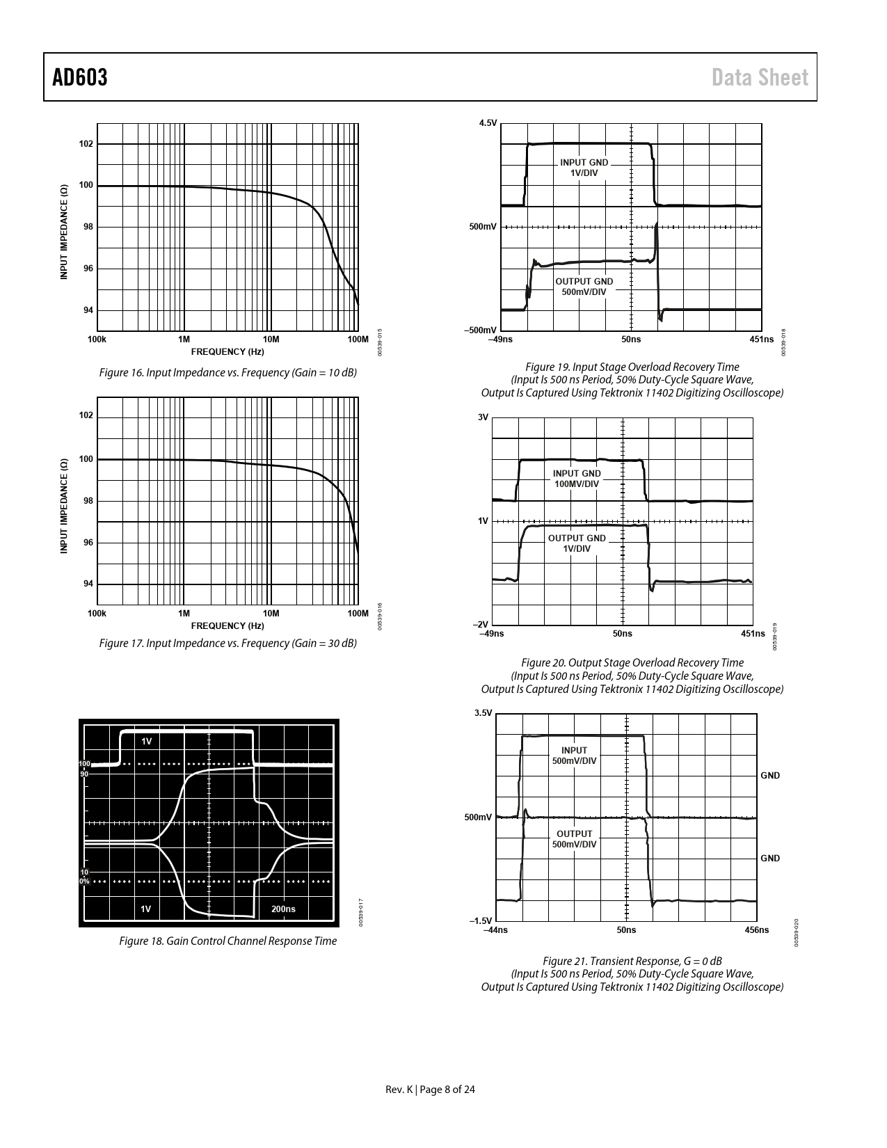 AD603Data Sheet4.5V102INPUT GND1V/DIV)100(ΩNCE DA98500mVE P M I UT P96INOUTPUT GND500mV/DIV94 5 8 –500mV 01 100k1M10M100M -01 9- –49ns50ns451ns 9 53 FREQUENCY (Hz) 53 00 00 Figure 19. Input Stage Overload Recovery Time Figure 16. Input Impedance vs. Frequency (Gain = 10 dB) (Input Is 500 ns Period, 50% Duty-Cycle Square Wave, Output Is Captured Using Tektronix 11402 Digitizing Oscilloscope) 1023V)100(ΩINPUT GNDNCE100MV/DIVDA98E P M I1VUT P96OUTPUT GNDIN1V/DIV94 6 01 100k1M10M100M 9- 53 FREQUENCY (Hz) 9 –2V 00 -01 –49ns50ns451ns 9 Figure 17. Input Impedance vs. Frequency (Gain = 30 dB) 53 00 Figure 20. Output Stage Overload Recovery Time (Input Is 500 ns Period, 50% Duty-Cycle Square Wave, Output Is Captured Using Tektronix 11402 Digitizing Oscilloscope) 3.5V1VINPUT100500mV/DIV90GND500mVOUTPUT500mV/DIVGND100% 7 01 1V200ns 9- 53 0 –1.5V 00 -02 –44ns50ns456ns 9 Figure 18. Gain Control Channel Response Time 53 00 Figure 21. Transient Response, G = 0 dB (Input Is 500 ns Period, 50% Duty-Cycle Square Wave, Output Is Captured Using Tektronix 11402 Digitizing Oscilloscope) Rev. K | Page 8 of 24 Document Outline Features Applications General Description Functional Block Diagram Revision History Specifications Absolute Maximum Ratings ESD Caution Pin Configurations and Function Descriptions Typical Performance Characteristics Test Circuits Theory of Operation Noise Performance The Gain Control Interface Programming the Fixed-Gain Amplifier Using Pin Strapping Using the AD603 in Cascade Sequential Mode (Optimal SNR) Parallel Mode (Simplest Gain Control Interface) Low Gain Ripple Mode (Minimum Gain Error) Applications Information A Low Noise AGC Amplifier Caution Evaluation Board Outline Dimensions Ordering Guide