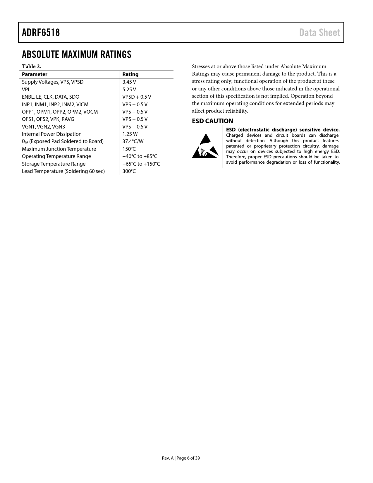 ADRF6518. Data Sheet. ABSOLUTE MAXIMUM RATINGS Table 2. Parameter. Rating. ESD CAUTION