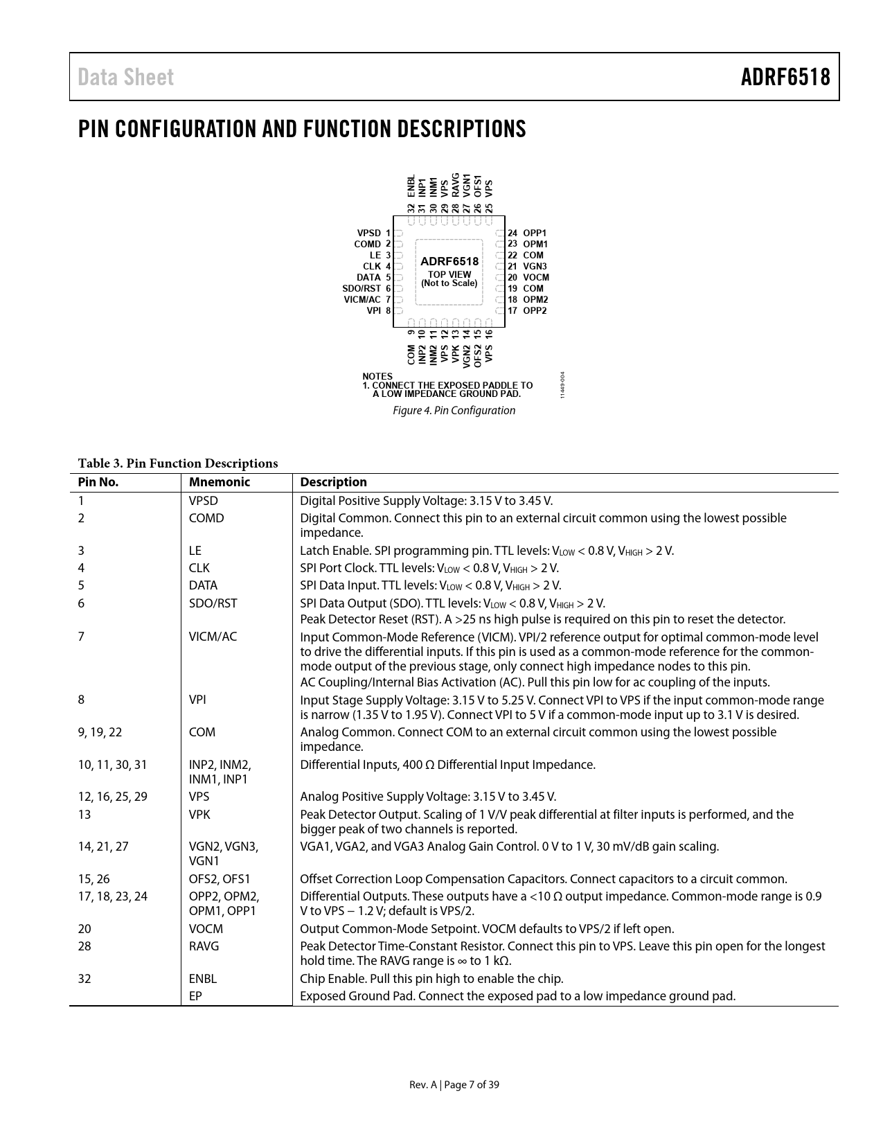 Data Sheet ADRF6518 PIN CONFIGURATION AND FUNCTION DESCRIPTIONS L G 1 1 B 1 1 S V N S S N P M P A G F P E NI NI V R V O V 32 31 30 29 28 27 26 25 VPSD 1 24 OPP1 COMD 2 23 OPM1 LE 3 22 COM ADRF6518 CLK 4 21 VGN3 DATA TOP VIEW 5 20 VOCM (Not to Scale) SDO/RST 6 19 COM VICM/AC 7 18 OPM2 VPI 8 17 OPP2 9 10 11 12 13 14 15 16 M 2 2 S K 2 2 S O P M P P N S P C NI N F I V V G V V O NOTES 1. CONNECT THE EXPOSED PADDLE TO