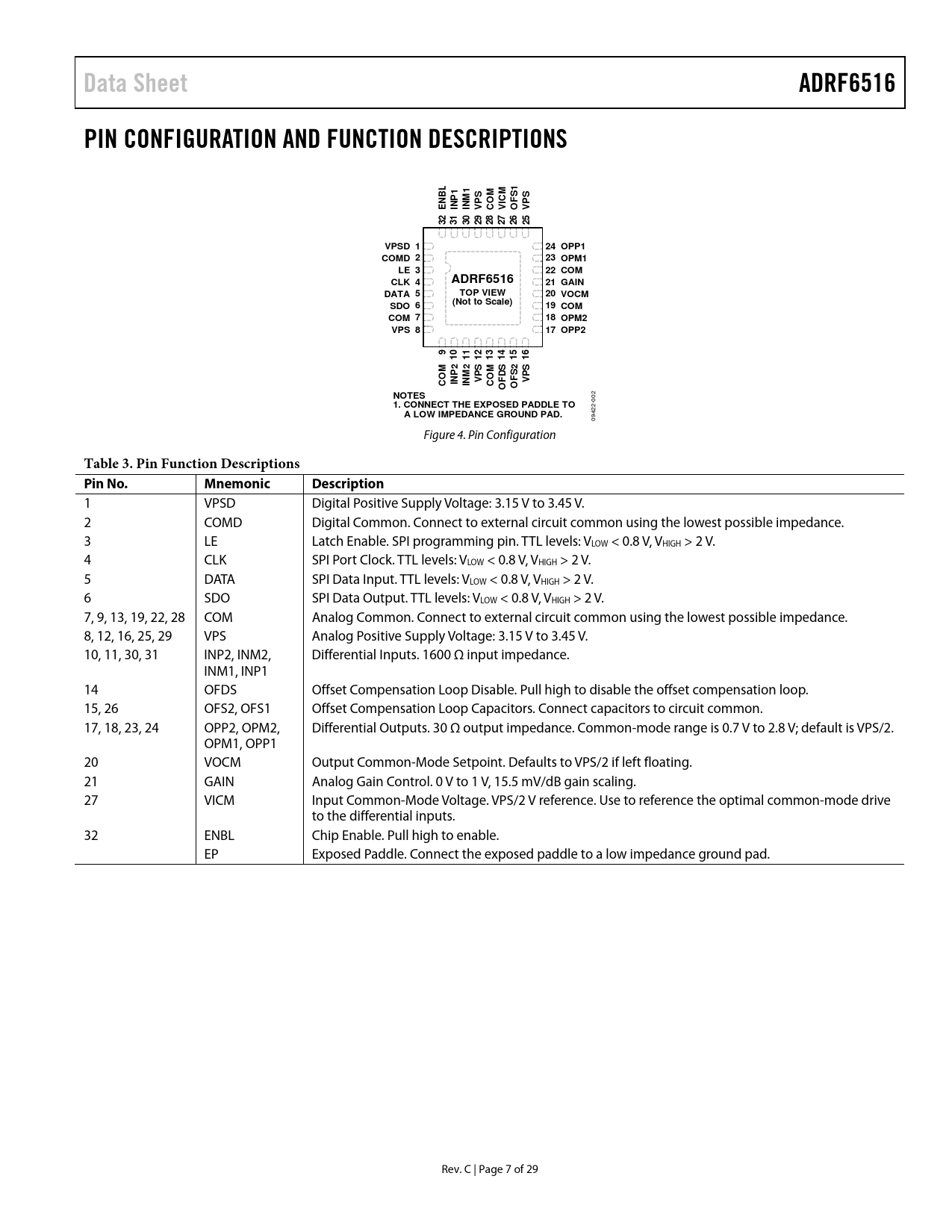 1 VPSD Digital Positive Supply Voltage: 3.15 V to 3.45 V. 2 COMD Digital Common. Connect to external circuit common using the lowest possible impedance. 3 LE Latch Enable. SPI programming pin. TTL levels: VLOW < 0.8 V, VHIGH > 2 V. 4 CLK SPI Port Clock. TTL levels: VLOW < 0.8 V, VHIGH > 2 V. 5 DATA SPI Data Input. TTL levels: VLOW < 0.8 V, VHIGH > 2 V. 6 SDO SPI Data Output. TTL levels: VLOW < 0.8 V, VHIGH > 2 V. 7, 9, 13, 19, 22, 28 COM Analog Common. Connect to external circuit common using the lowest possible impedance. 8, 12, 16, 25, 29 VPS Analog Positive Supply Voltage: 3.15 V to 3.45 V. 10, 11, 30, 31 INP2, INM2, Differential Inputs. 1600 Ω input impedance. INM1, INP1 14 OFDS Offset Compensation Loop Disable. Pull high to disable the offset compensation loop. 15, 26 OFS2, OFS1 Offset Compensation Loop Capacitors. Connect capacitors to circuit common. 17, 18, 23, 24 OPP2, OPM2, Differential Outputs. 30 Ω output impedance. Common-mode range is 0.7 V to 2.8 V; default is VPS/2. OPM1, OPP1 20 VOCM Output Common-Mode Setpoint. Defaults to VPS/2 if left floating. 21 GAIN Analog Gain Control. 0 V to 1 V, 15.5 mV/dB gain scaling. 27 VICM Input Common-Mode Voltage. VPS/2 V reference. Use to reference the optimal common-mode drive to the differential inputs. 32 ENBL Chip Enable. Pull high to enable. EP Exposed Paddle. Connect the exposed paddle to a low impedance ground pad. Rev. C | Page 7 of 29 Document Outline FEATURES APPLICATIONS FUNCTIONAL BLOCK DIAGRAM GENERAL DESCRIPTION TABLE OF CONTENTS REVISION HISTORY SPECIFICATIONS TIMING DIAGRAMS ABSOLUTE MAXIMUM RATINGS ESD CAUTION PIN CONFIGURATION AND FUNCTION DESCRIPTIONS TYPICAL PERFORMANCE CHARACTERISTICS REGISTER MAP AND CODES THEORY OF OPERATION INPUT BUFFERS PROGRAMMABLE FILTERS VARIABLE GAIN AMPLIFIERS (VGAs) OUTPUT BUFFERS/ADC DRIVERS DC OFFSET COMPENSATION LOOP PROGRAMMING THE FILTERS AND GAINS NOISE CHARACTERISTICS DISTORTION CHARACTERISTICS MAXIMIZING THE DYNAMIC RANGE KEY PARAMETERS FOR QUADRATURE-BASED RECEIVERS APPLICATIONS INFORMATION BASIC CONNECTIONS SUPPLY DECOUPLING INPUT SIGNAL PATH OUTPUT SIGNAL PATH DC OFFSET COMPENSATION LOOP ENABLED COMMON-MODE BYPASSING SERIAL PORT CONNECTIONS ENABLE/DISABLE FUNCTION ERROR VECTOR MAGNITUDE (EVM) PERFORMANCE EVM TEST SETUP EFFECT OF FILTER BANDWIDTH ON EVM EFFECT OF OUTPUT VOLTAGE LEVELS ON EVM EFFECT OF COFS VALUE ON EVM EVALUATION BOARD EVALUATION BOARD CONTROL SOFTWARE SCHEMATICS AND ARTWORK OUTLINE DIMENSIONS ORDERING GUIDE
