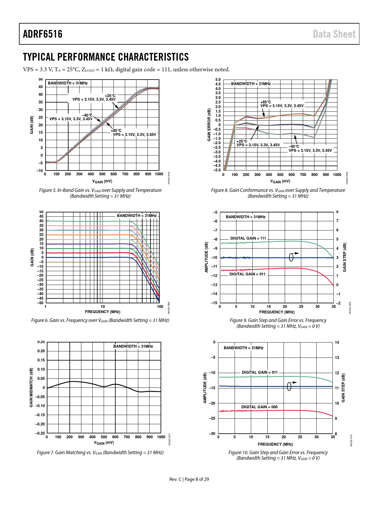 09422- Figure 5. In-Band Gain vs. VGAIN over Supply and Temperature Figure 8. Gain Conformance vs. VGAIN over Supply and Temperature (Bandwidth Setting = 31 MHz) (Bandwidth Setting = 31 MHz)