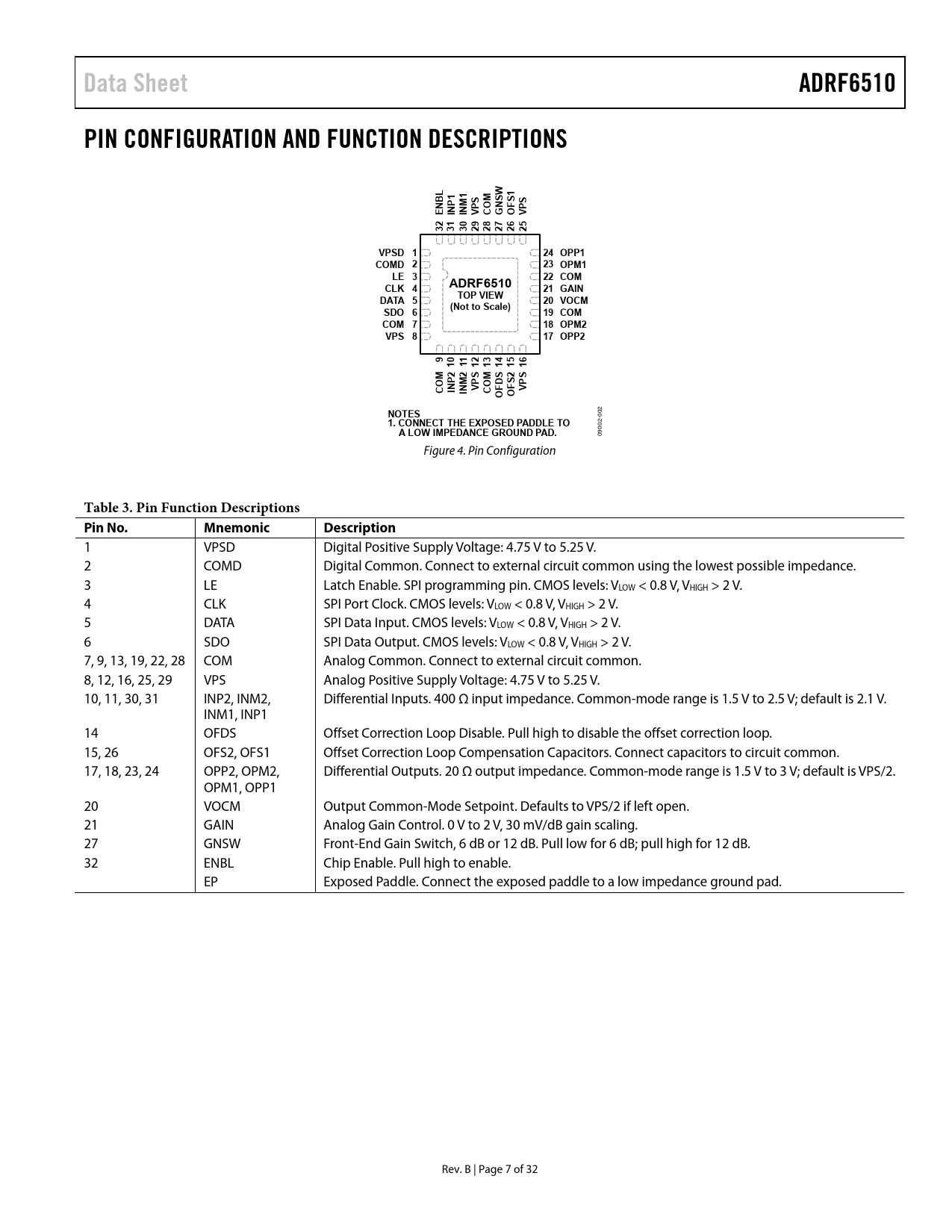 Data Sheet. ADRF6510. PIN CONFIGURATION AND FUNCTION DESCRIPTIONS. NI NI V C G O V. VPSD 1. 24 OPP1. COMD 2. 23 OPM1. LE 3. 22 COM. CLK 4