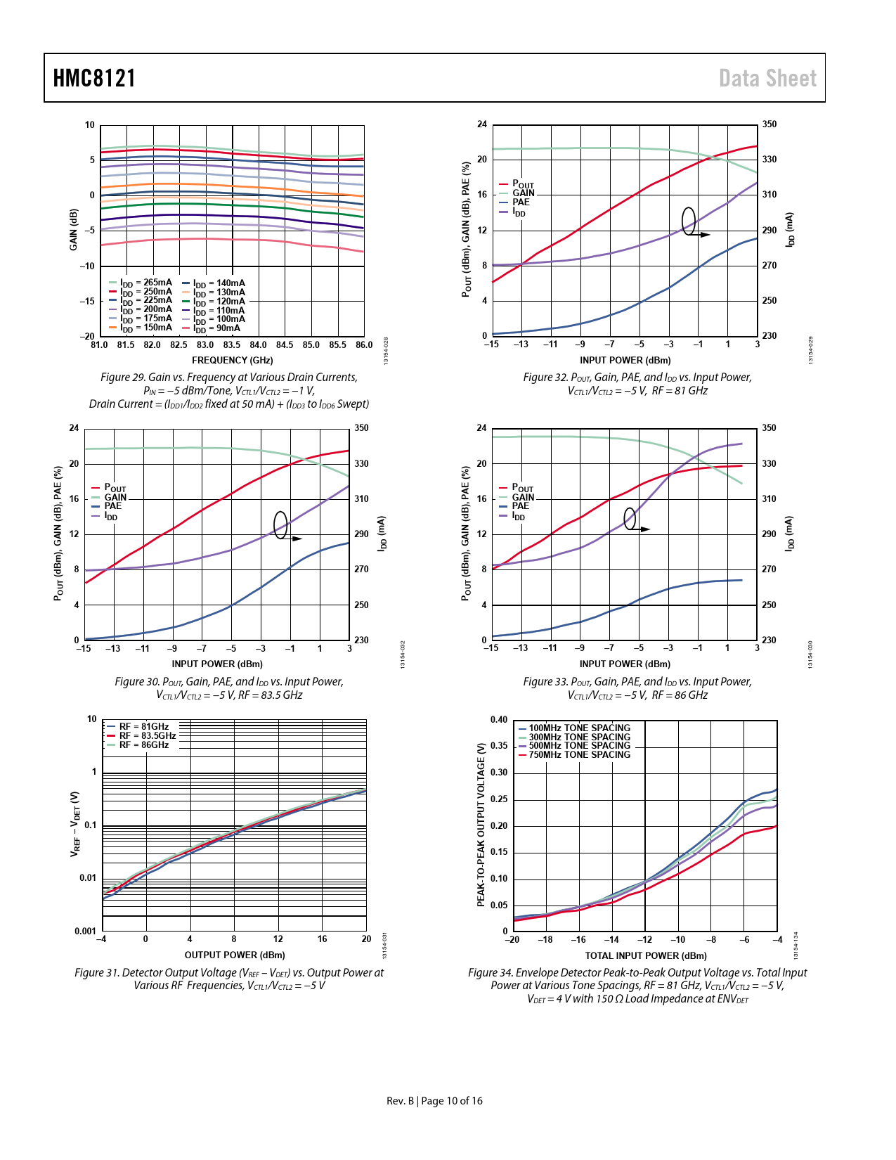 HMC8121. Data Sheet. 350. 330. ) (% E A. POUT. P 16. GAIN. 310. PAE. IDD. (d –5. 290. I DD. ), m. –10. 270. DD = 265mA. IDD = 140mA. DD = 250mA. IDD = 130mA. –15