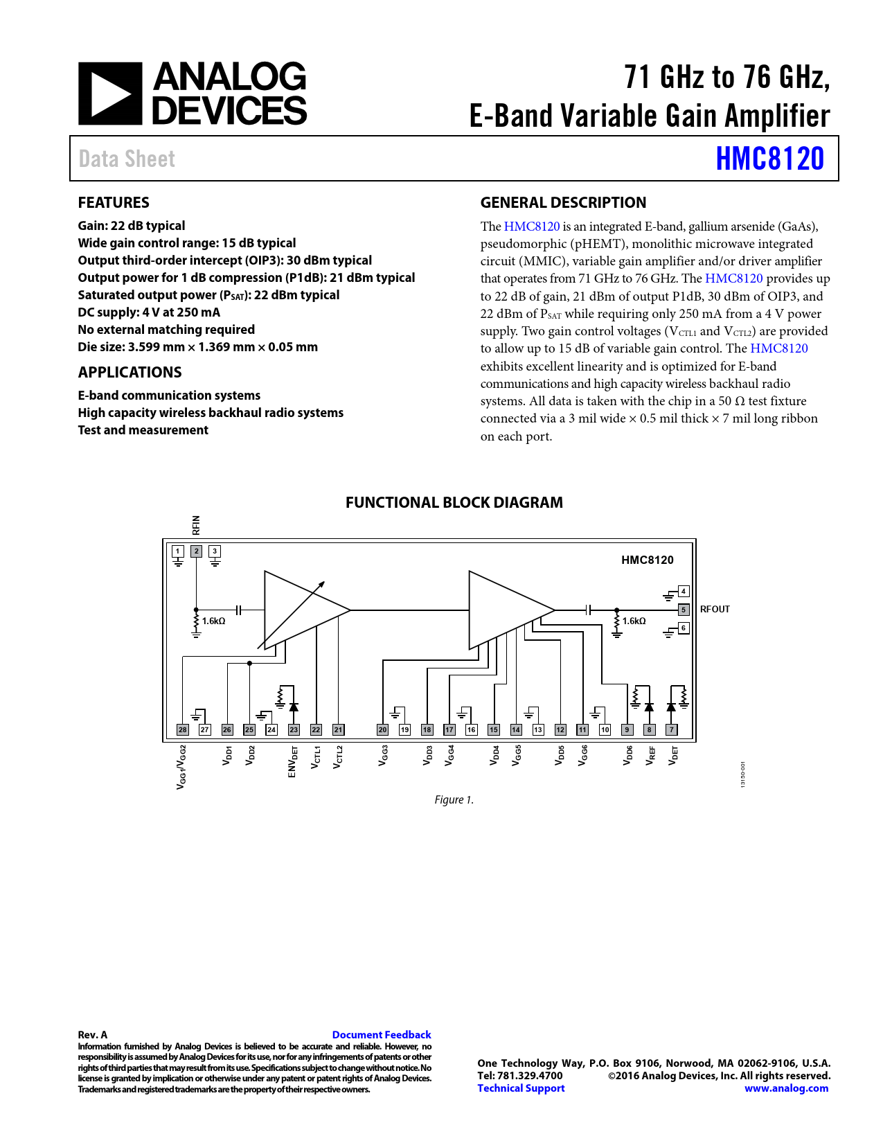 71 GHz to 76 GHz,. E-Band Variable Gain Amplifier. Data Sheet. HMC8120. FEATURES. GENERAL DESCRIPTION. Gain: 22 dB typical