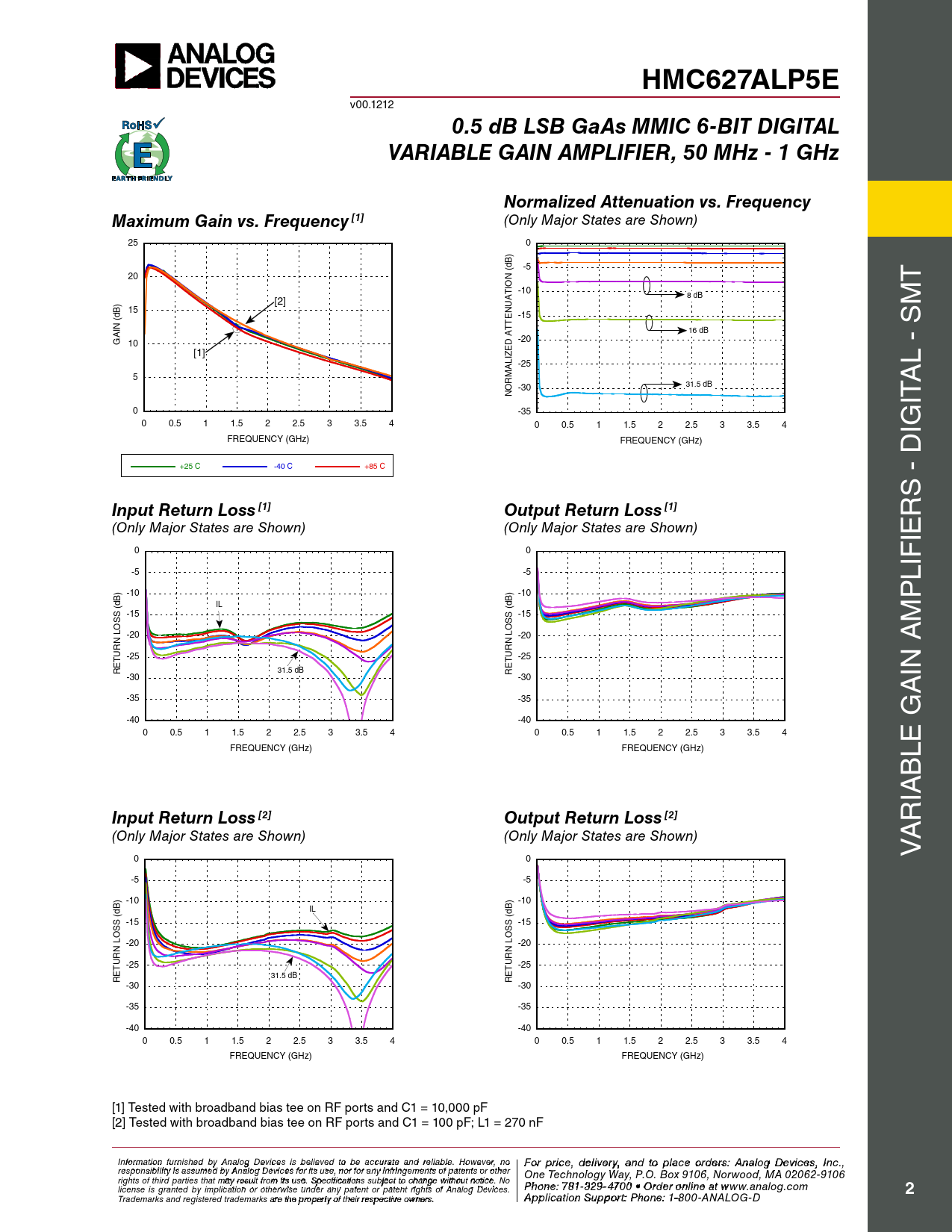 HMC627ALP5E v00.1212 0.5 dB LSB GaAs MMIC 6-BIT DIGITALVARIABLE GAIN AMPLIFIER, 50 MHz - 1 GHzNormalized Attenuation vs. FrequencyMaximum Gain vs. Frequency [1] (Only Major States are Shown) 25 0 ) B (d -5 20 N T IO T -10 8 dB ) [2] UA M B 15 N d E -15 ( T IN T 16 dB A A G 10 -20 D [1] E IZ L -25 A L - S 5 RM -30 31.5 dB NO ITA 0 -35 0 0.5 1 1.5 2 2.5 3 3.5 4 0 0.5 1 1.5 2 2.5 3 3.5 4 IG FREQUENCY (GHz) FREQUENCY (GHz) +25 C -40 C +85 C S - D Input Return Loss [1]Output Return Loss [1] R (Only Major States are Shown) (Only Major States are Shown) IE 0 0 -5 -5 LIF ) -10 ) -10 B B P (d IL (d S -15 S -15 S S M O O L -20 L -20 N N UR -25 UR T -25 T RE 31.5 dB RE -30 -30 IN A A -35 -35 -40 -40 0 0.5 1 1.5 2 2.5 3 3.5 4 0 0.5 1 1.5 2 2.5 3 3.5 4 FREQUENCY (GHz) FREQUENCY (GHz) LE G B IA Input Return Loss [2]Output Return Loss [2] R (Only Major States are Shown) (Only Major States are Shown) A 0 0 V -5 -5 ) -10 ) -10 B IL B (d (d S -15 S -15 S S O O L -20 L -20 N N UR -25 UR T -25 T RE 31.5 dB RE -30 -30 -35 -35 -40 -40 0 0.5 1 1.5 2 2.5 3 3.5 4 0 0.5 1 1.5 2 2.5 3 3.5 4 FREQUENCY (GHz) FREQUENCY (GHz) [1] Tested with broadband bias tee on RF ports and C1 = 10,000 pF [2] Tested with broadband bias tee on RF ports and C1 = 100 pF; L1 = 270 nF I F nf o or r p mati r o in cfe ur , d nish e e l d iv b e y r A y a nalo n g d t Devi o p ces i la s c bele o ieve rd d t e o rbs e : H acc iutrtatite e M and ic reli rao bl w e. a H v o e C wever o , nrp o For price, delivery, and to place orders: Analog Devices, Inc., responsibility is assumed by Analog Devices for its use, nor for any infringements of patents or other oration, 2 Elizabeth Drive, Chelmsford, MA 01824 One Technology Way, P.O. Box 9106, Norwood, MA 02062-9106 Phone: 978-250-3343 Fax: 978-250-3373 O rights of third parties that may result from its use. Specifications subject to change without notice. No rd Phoe n r O e: 7 n- 81-li 3 n 2 e a 9-4 t w 70 ww 0 • O . rdh e itt r o it nle i . n co e a m license is granted by implication or otherwise under any patent or patent rights of Analog Devices. t www.analog.com 2 Application Support: Phon Trademarks and registered trademarks are the property of their respective owners. e: 978-250-334 A 3 o pplic r a atio pp n S s u @ p h por ittti : Pte ho.c n o e m : 1-800-ANALOG-D