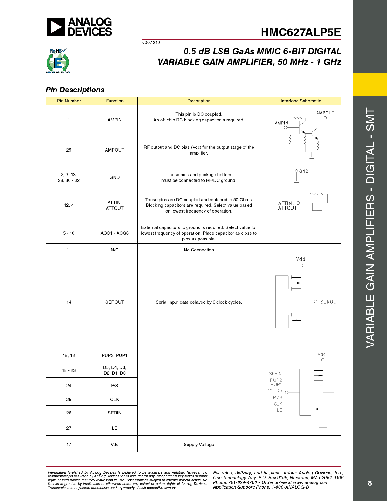 HMC627ALP5E v00.1212 0.5 dB LSB GaAs MMIC 6-BIT DIGITALVARIABLE GAIN AMPLIFIER, 50 MHz - 1 GHzPin Descriptions Pin Number Function Description Interface Schematic This pin is DC coupled. T 1 AMPIN An off chip DC blocking capacitor is required. M RF output and DC bias (Vcc) for the output stage of the L - S 29 AMPOUT amplifier. ITA 2, 3, 13, These pins and package bottom IG GND 28, 30 - 32 must be connected to RF/DC ground. These pins are DC coupled and matched to 50 Ohms. ATTIN, S - D 12, 4 Blocking capacitors are required. Select value based ATTOUT R on lowest frequency of operation. IE External capacitors to ground is required. Select value for 5 - 10 ACG1 - ACG6 lowest frequency of operation. Place capacitor as close to LIF pins as possible. P 11 N/C No Connection M IN A A 14 SEROUT Serial input data delayed by 6 clock cycles. LE G B IA R A V 15, 16 PUP2, PUP1 D5, D4, D3, 18 - 23 D2, D1, D0 24 P/S 25 CLK 26 SERIN 27 LE 17 Vdd Supply Voltage I F nf o or r p mati r o in cfe ur , d nish e e l d iv b e y r A y a nalo n g d t Devi o p ces i la s c bele o ieve rd d t e o rbs e : H acc iutrtatite e M and ic reli rao bl w e. a H v o e C wever o , nrp o For price, delivery, and to place orders: Analog Devices, Inc., responsibility is assumed by Analog Devices for its use, nor for any infringements of patents or other oration, 2 Elizabeth Drive, Chelmsford, MA 01824 One Technology Way, P.O. Box 9106, Norwood, MA 02062-9106 Phone: 978-250-3343 Fax: 978-250-3373 O rights of third parties that may result from its use. Specifications subject to change without notice. No rd Phoe n r O e: 7 n- 81-li 3 n 2 e a 9-4 t w 70 ww 0 • O . rdh e itt r o it nle i . n co e a m license is granted by implication or otherwise under any patent or patent rights of Analog Devices. t www.analog.com 8 Application Support: Phon Trademarks and registered trademarks are the property of their respective owners. e: 978-250-334 A 3 o pplic r a atio pp n S s u @ p h por ittti : Pte ho.c n o e m : 1-800-ANALOG-D