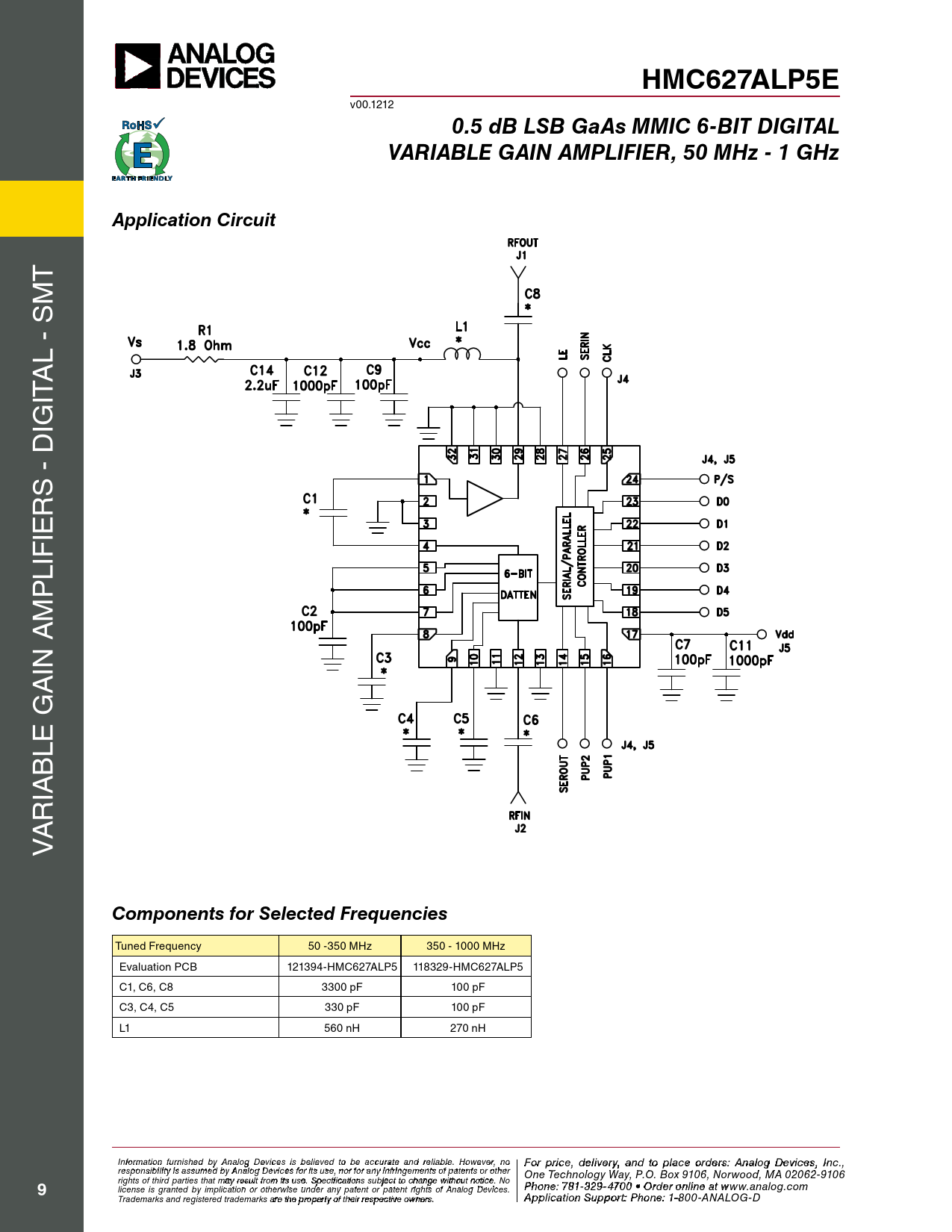 HMC627ALP5E v00.1212 0.5 dB LSB GaAs MMIC 6-BIT DIGITALVARIABLE GAIN AMPLIFIER, 50 MHz - 1 GHzApplication Circuit T M L - S ITA IG S - D R IE LIF P M IN A A LE G B IA R A V Components for Selected Frequencies Tuned Frequency 50 -350 MHz 350 - 1000 MHz Evaluation PCB 121394-HMC627ALP5 118329-HMC627ALP5 C1, C6, C8 3300 pF 100 pF C3, C4, C5 330 pF 100 pF L1 560 nH 270 nH I F nf o or r p mati r o in cfe ur , d nish e e l d iv b e y r A y a nalo n g d t Devi o p ces i la s c bele o ieve rd d t e o rbs e : H acc iutrtatite e M and ic reli rao bl w e. a H v o e C wever o , nrp o For price, delivery, and to place orders: Analog Devices, Inc., responsibility is assumed by Analog Devices for its use, nor for any infringements of patents or other oration, 2 Elizabeth Drive, Chelmsford, MA 01824 One Technology Way, P.O. Box 9106, Norwood, MA 02062-9106 Phone: 978-250-3343 Fax: 978-250-3373 O rights of third parties that may result from its use. Specifications subject to change without notice. No rd Phoe n r O e: 7 n- 81-li 3 n 2 e a 9-4 t w 70 ww 0 • O . rdh e itt r o it nle i . n co e a m 9 license is granted by implication or otherwise under any patent or patent rights of Analog Devices. t www.analog.com Application Support: Phon Trademarks and registered trademarks are the property of their respective owners. e: 978-250-334 A 3 o pplic r a atio pp n S s u @ p h por ittti : Pte ho.c n o e m : 1-800-ANALOG-D