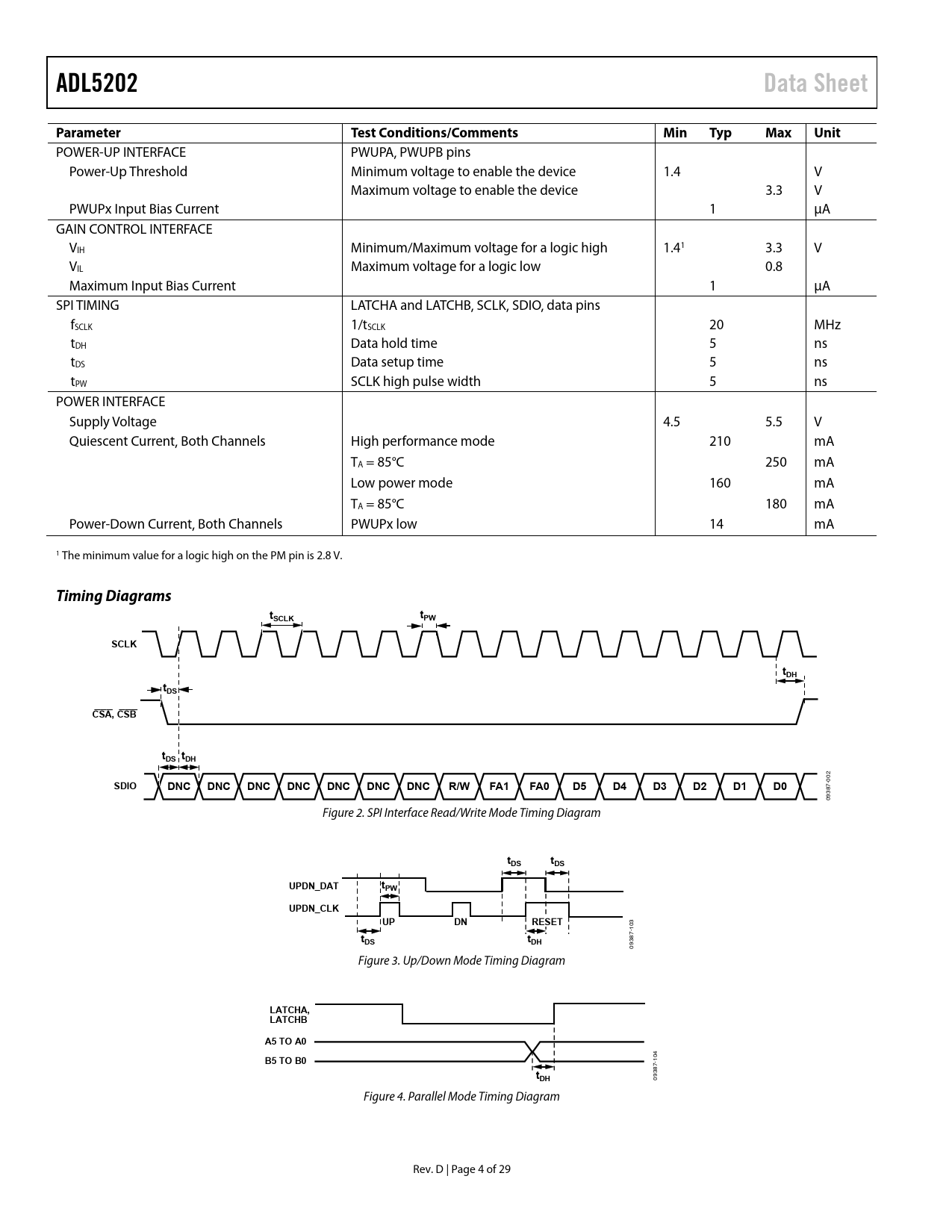 ADL5202. Data Sheet. Parameter. Test Conditions/Comments. Min. Typ. Max. Unit. Timing Diagrams. tSCLK. tPW. SCLK. tDH. tDS. ___ ___. CSA, CSB. tDS tDH