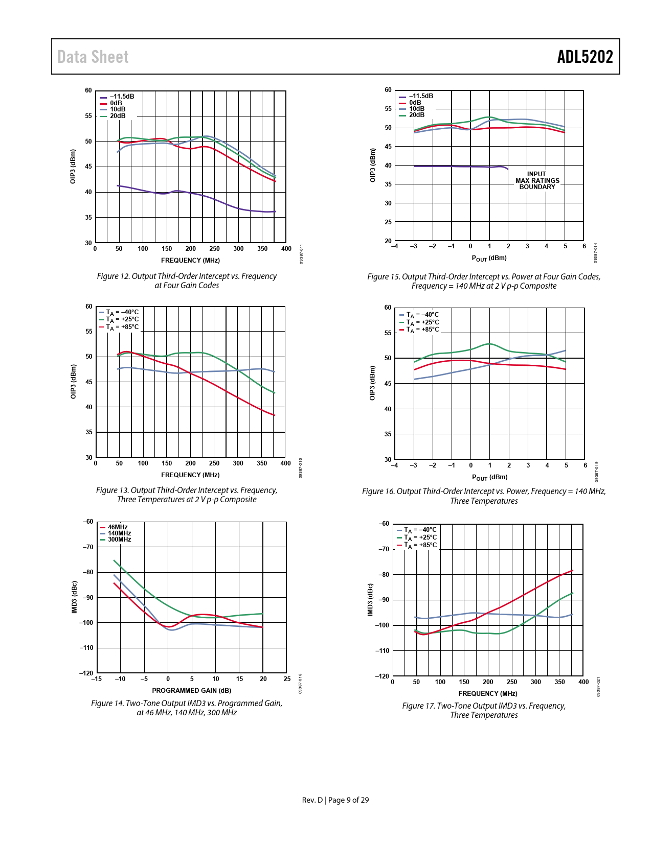 Data Sheet ADL5202 –11.5dB 0dB 10dB 20dB 3 ( INPUT OIP MAX RATINGS BOUNDARY 100 150 200 250 300 350 400 FREQUENCY (MHz) POUT (dBm)