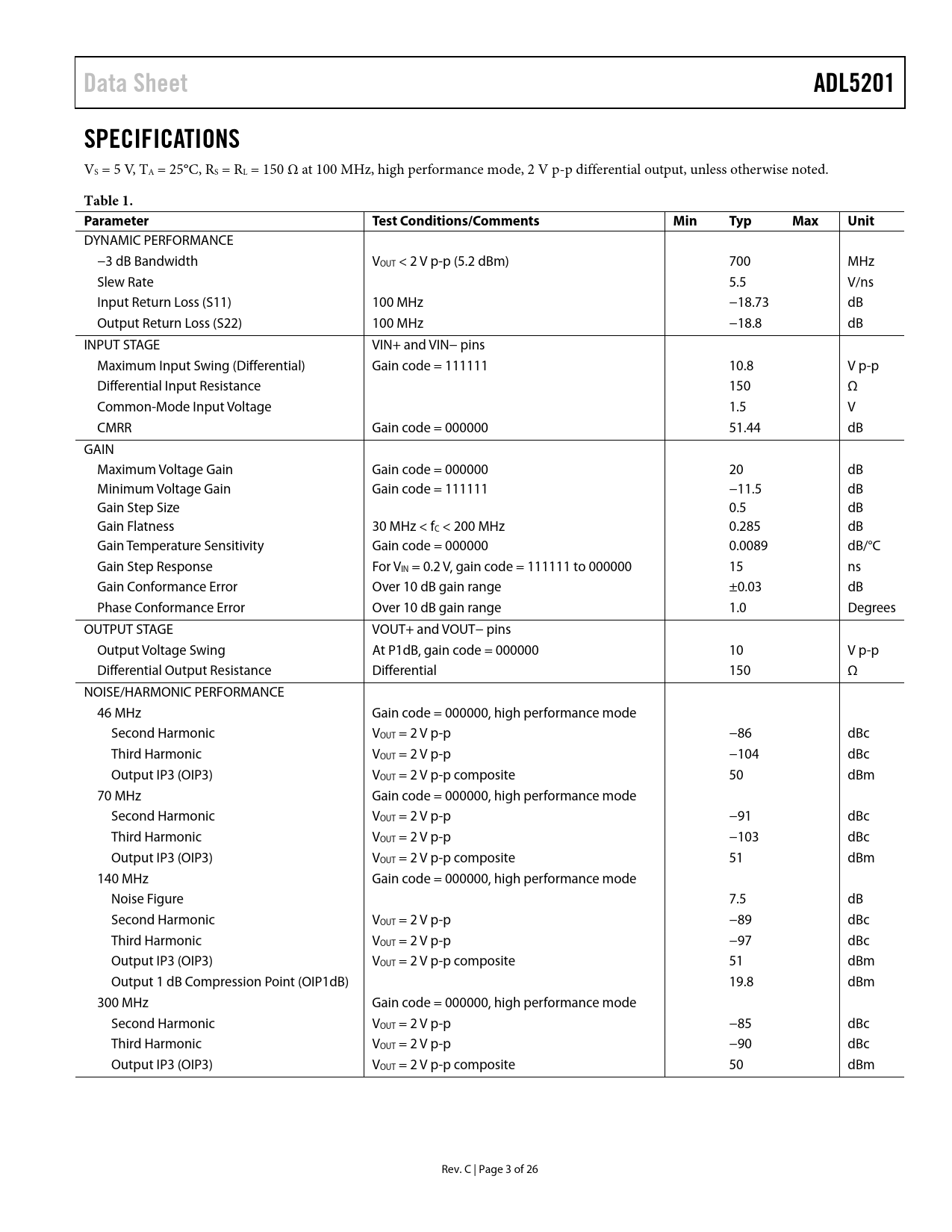 Data SheetADL5201SPECIFICATIONS VS = 5 V, TA = 25°C, RS = RL = 150 Ω at 100 MHz, high performance mode, 2 V p-p differential output, unless otherwise noted. Table 1. ParameterTest Conditions/CommentsMinTypMaxUnit DYNAMIC PERFORMANCE −3 dB Bandwidth VOUT < 2 V p-p (5.2 dBm) 700 MHz Slew Rate 5.5 V/ns Input Return Loss (S11) 100 MHz −18.73 dB Output Return Loss (S22) 100 MHz −18.8 dB INPUT STAGE VIN+ and VIN− pins Maximum Input Swing (Differential) Gain code = 111111 10.8 V p-p Differential Input Resistance 150 Ω Common-Mode Input Voltage 1.5 V CMRR Gain code = 000000 51.44 dB GAIN Maximum Voltage Gain Gain code = 000000 20 dB Minimum Voltage Gain Gain code = 111111 −11.5 dB Gain Step Size 0.5 dB Gain Flatness 30 MHz < fC < 200 MHz 0.285 dB Gain Temperature Sensitivity Gain code = 000000 0.0089 dB/°C Gain Step Response For VIN = 0.2 V, gain code = 111111 to 000000 15 ns Gain Conformance Error Over 10 dB gain range ±0.03 dB Phase Conformance Error Over 10 dB gain range 1.0 Degrees OUTPUT STAGE VOUT+ and VOUT− pins Output Voltage Swing At P1dB, gain code = 000000 10 V p-p Differential Output Resistance Differential 150 Ω NOISE/HARMONIC PERFORMANCE 46 MHz Gain code = 000000, high performance mode Second Harmonic VOUT = 2 V p-p −86 dBc Third Harmonic VOUT = 2 V p-p −104 dBc Output IP3 (OIP3) VOUT = 2 V p-p composite 50 dBm 70 MHz Gain code = 000000, high performance mode Second Harmonic VOUT = 2 V p-p −91 dBc Third Harmonic VOUT = 2 V p-p −103 dBc Output IP3 (OIP3) VOUT = 2 V p-p composite 51 dBm 140 MHz Gain code = 000000, high performance mode Noise Figure 7.5 dB Second Harmonic VOUT = 2 V p-p −89 dBc Third Harmonic VOUT = 2 V p-p −97 dBc Output IP3 (OIP3) VOUT = 2 V p-p composite 51 dBm Output 1 dB Compression Point (OIP1dB) 19.8 dBm 300 MHz Gain code = 000000, high performance mode Second Harmonic VOUT = 2 V p-p −85 dBc Third Harmonic VOUT = 2 V p-p −90 dBc Output IP3 (OIP3) VOUT = 2 V p-p composite 50 dBm Rev. C | Page 3 of 26 Document Outline FEATURES APPLICATIONS FUNCTIONAL BLOCK DIAGRAM GENERAL DESCRIPTION TABLE OF CONTENTS REVISION HISTORY SPECIFICATIONS TIMING DIAGRAMS ABSOLUTE MAXIMUM RATINGS ESD CAUTION PIN CONFIGURATION AND FUNCTION DESCRIPTIONS TYPICAL PERFORMANCE CHARACTERISTICS CHARACTERIZATION AND TEST CIRCUITS THEORY OF OPERATION DIGITAL INTERFACE OVERVIEW PARALLEL DIGITAL INTERFACE SERIAL PERIPHERAL INTERFACE (SPI) Fast Attack UP/DOWN INTERFACE Truth Table LOGIC TIMING CIRCUIT DESCRIPTION BASIC STRUCTURE INPUT SYSTEM OUTPUT AMPLIFIER GAIN CONTROL APPLICATIONS INFORMATION BASIC CONNECTIONS ADC DRIVING LAYOUT CONSIDERATIONS EVALUATION BOARD EVALUATION BOARD CONTROL SOFTWARE SCHEMATICS AND ARTWORK EVALUATION BOARD CONFIGURATION OPTIONS Configuration Options for the Main Section Configuration Options for the USB Section OUTLINE DIMENSIONS ORDERING GUIDE