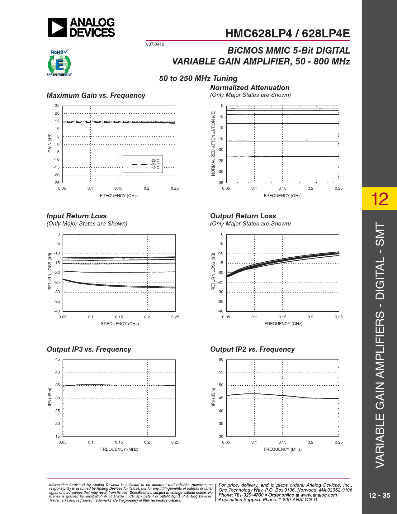 HMC628LP4 / 628LP4E v07.0410 BiCMOS MMIC 5-Bit DIGITALVARIABLE GAIN AMPLIFIER, 50 - 800 MHz50 to 250 MHz TuningNormalized Attenuation (Only Major States are Shown) Maximum Gain vs. Frequency 25 0 20 -5 15 ON (dB) 10 -10 5 -15 0 GAIN (dB) -20 -5 ZED ATTENUATI -10 +25 C -25 +85 C -15 -40 C -30 -20 NORMALI -25 -35 0.05 0.1 0.15 0.2 0.25 0.05 0.1 0.15 0.2 0.25 FREQUENCY (GHz) FREQUENCY (GHz) 12 Input Return LossOutput Return Loss (Only Major States are Shown) (Only Major States are Shown) T 0 0 -5 -5 -10 -10 -15 -15 L - SM A -20 -20 IT -25 -25 RETURN LOSS (dB) RETURN LOSS (dB) -30 -30 IG -35 -35 -40 -40 - D 0.05 0.1 0.15 0.2 0.25 0.05 0.1 0.15 0.2 0.25 S FREQUENCY (GHz) FREQUENCY (GHz) R IE IF Output IP3 vs. FrequencyOutput IP2 vs. Frequency L 45 60 P M 40 55 A 35 50 IN 30 45 A IP3 (dBm) IP3 (dBm) 25 40 G E 20 35 L B 15 30 0.05 0.1 0.15 0.2 0.25 0.05 0.1 0.15 0.2 0.25 IA FREQUENCY (MHz) FREQUENCY (MHz) R A V Inf F or o m r pr ation ifc ur e, de nished lbiv y e Anry alo a g n D d to p evices is la beclie o eved rde to b r e sa: H ccur iattti e tae M nd reliicr abl ow e. H a o v wee C ver, o n rp o o F roar tiporin c ,e 2 , 0 de A liv lepha R ry, an o d t ad, C o plac h e eolm rdesrfo s: rd, MA 01 Analog Devi 8 c 2 e 4 s, Inc., responsibility is assumed by Analog Devices for its use, nor for any infringements of patents or other One Technology Way, P.O. Box 9106, Norwood, MA 02062-9106 Phone: 978-250-3343 Fax: 978-250-3373 O rights of third parties that may result from its use. Specifications subject to change without notice. No rde Phon r O e: 7 n- 81 li 3 n 2 e a 9-4 t w 70 ww 0 • O . rdh e itt r o ite nli .c n o e a m license is granted by implication or otherwise under any patent or patent rights of Analog Devices. t www.analog.com 12 - 35 Application Support: Phon Trademarks and registered trademarks are the property of their respective owners. e: 978-250-334 A 3 o pplic r app ation S s u @ p h por ittti : Pte ho.c n o e m : 1-800-ANALOG-D