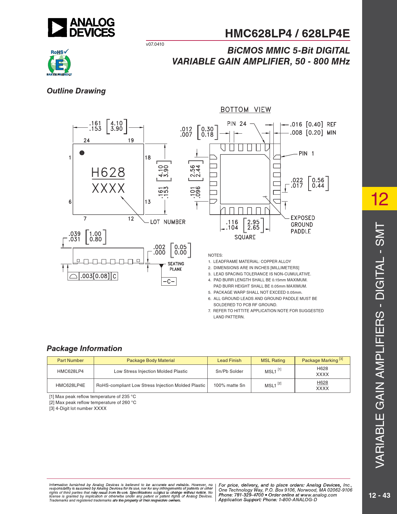 HMC628LP4 / 628LP4E BiCMOS MMIC 5-Bit DIGITAL VARIABLE GAIN AMPLIFIER, 50 - 800 MHz Outline Drawing Package Information