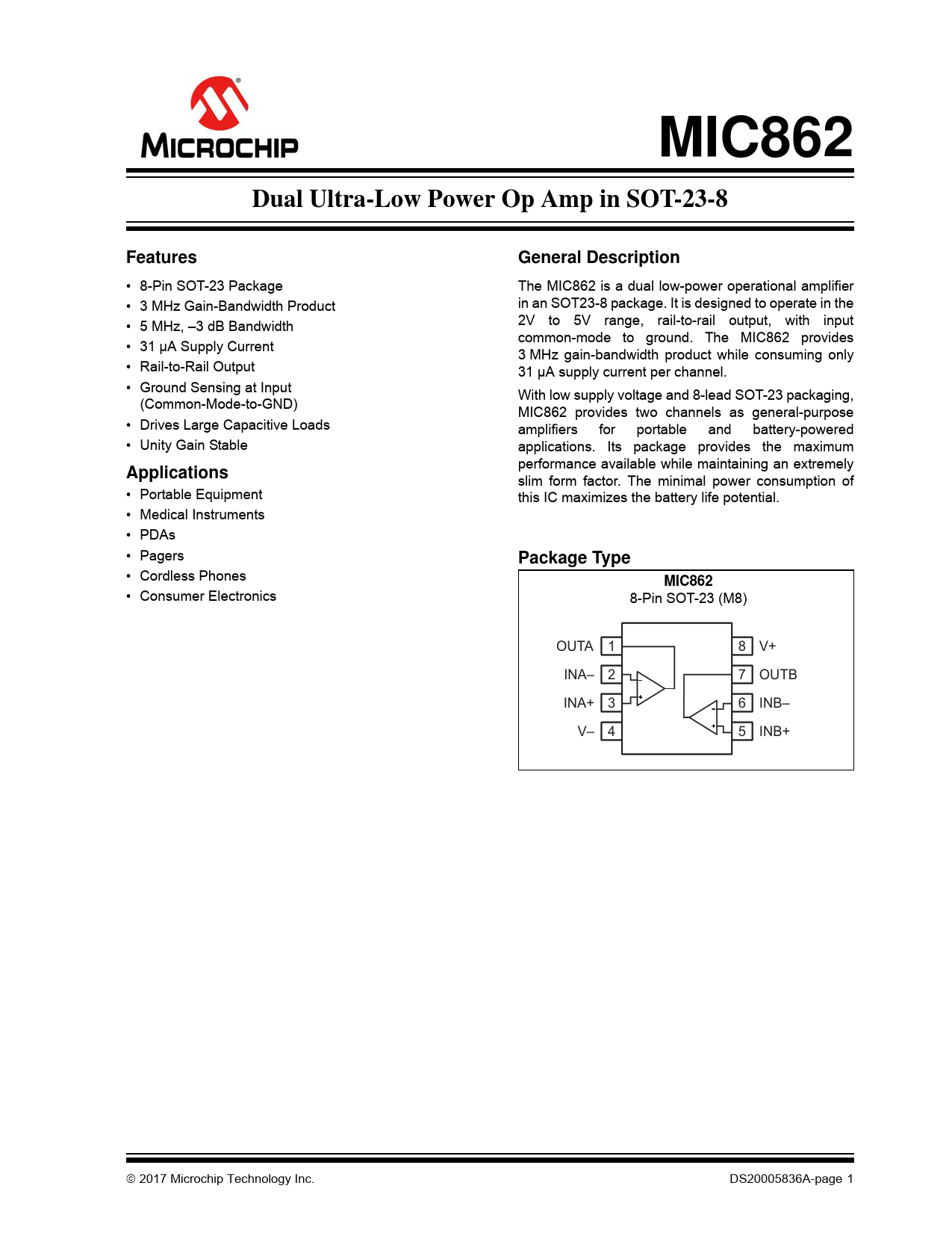 MIC862. Dual Ultra-Low Power Op Amp in SOT-23-8. Features. General Description. Applications. Package Type