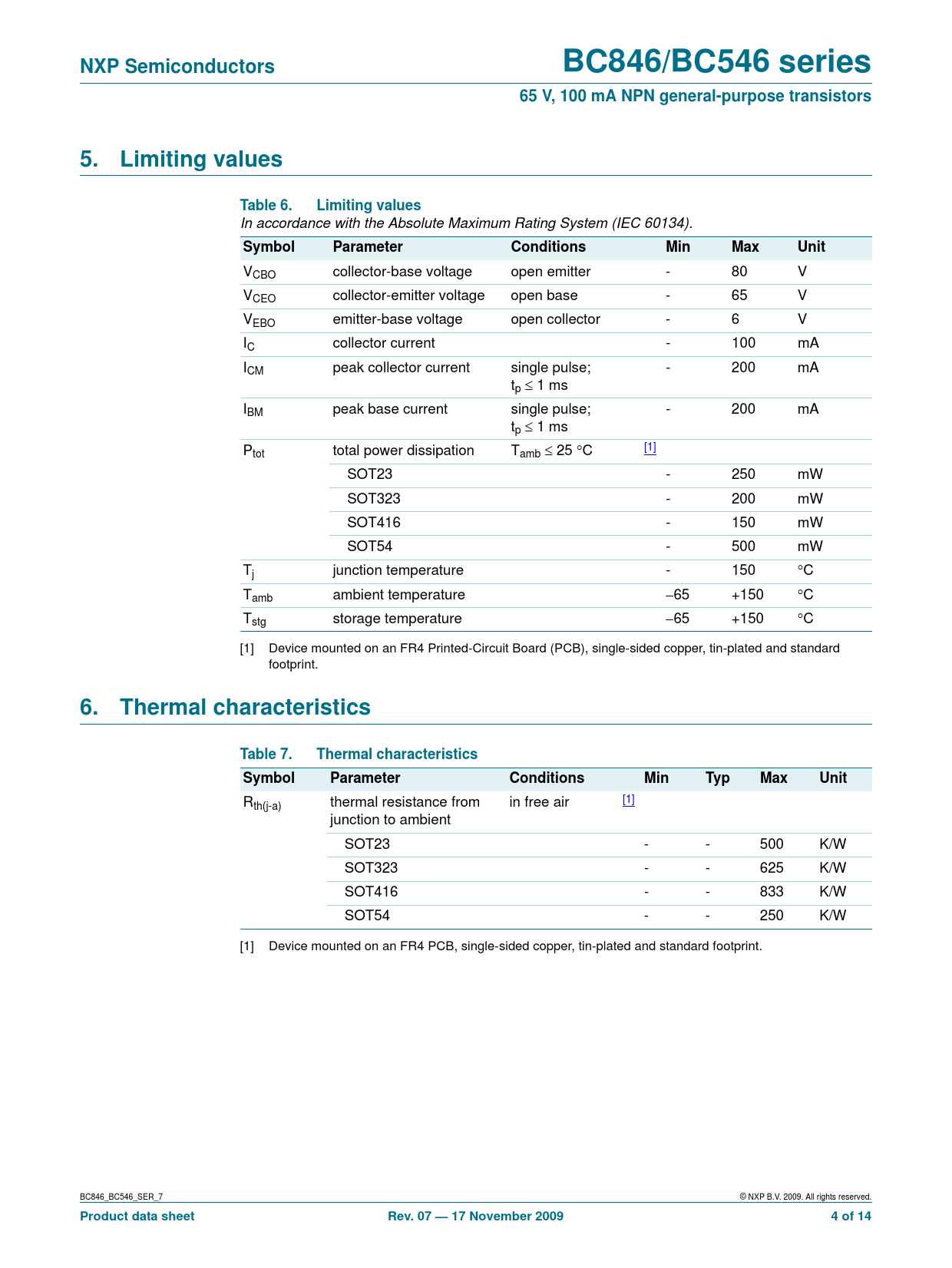 Rth(j-a) thermal resistance from in free air [1] junction to ambient SOT23 - - 500 K/W SOT323 - - 625 K/W SOT416 - - 833 K/W SOT54 - - 250 K/W [1] Device mounted on an FR4 PCB, single-sided copper, tin-plated and standard footprint. BC846_BC546_SER_7 © NXP B.V. 2009. All rights reserved.