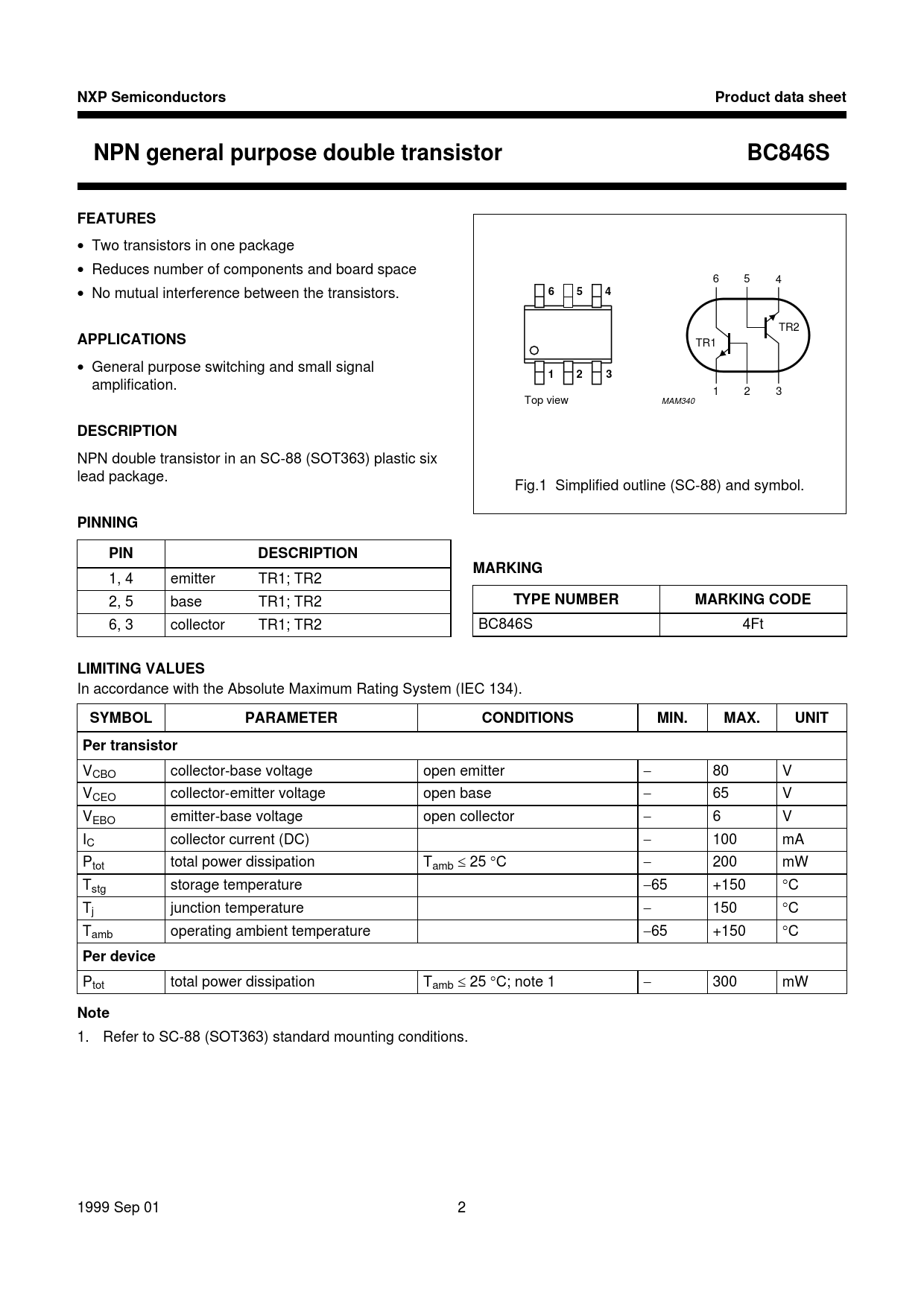 link to page 2 NXP SemiconductorsProduct data sheetNPN general purpose double transistorBC846SFEATURES • Two transistors in one package • Reduces number of components and board space handbook, halfpage 6 5 4 • No mutual interference between the transistors. 654 TR2 APPLICATIONS TR1 • General purpose switching and small signal 123 amplification. 1 2 3 Top view MAM340 DESCRIPTION NPN double transistor in an SC-88 (SOT363) plastic six lead package. Fig.1 Simplified outline (SC-88) and symbol. PINNINGPINDESCRIPTIONMARKING 1, 4 emitter TR1; TR2 2, 5 base TR1; TR2 TYPE NUMBERMARKING CODE 6, 3 collector TR1; TR2 BC846S 4Ft LIMITING VALUES In accordance with the Absolute Maximum Rating System (IEC 134). SYMBOLPARAMETERCONDITIONSMIN.MAX.UNITPer transistor VCBO collector-base voltage open emitter − 80 V VCEO collector-emitter voltage open base − 65 V VEBO emitter-base voltage open collector − 6 V IC collector current (DC) − 100 mA Ptot total power dissipation Tamb ≤ 25 °C − 200 mW Tstg storage temperature −65 +150 °C Tj junction temperature − 150 °C Tamb operating ambient temperature −65 +150 °C Per device Ptot total power dissipation Tamb ≤ 25 °C; note 1 − 300 mW Note 1. Refer to SC-88 (SOT363) standard mounting conditions. 1999 Sep 01 2 Document Outline Features Applications Description Pinning Marking Limiting values Thermal characteristics Characteristics Package outline Data sheet status Disclaimers