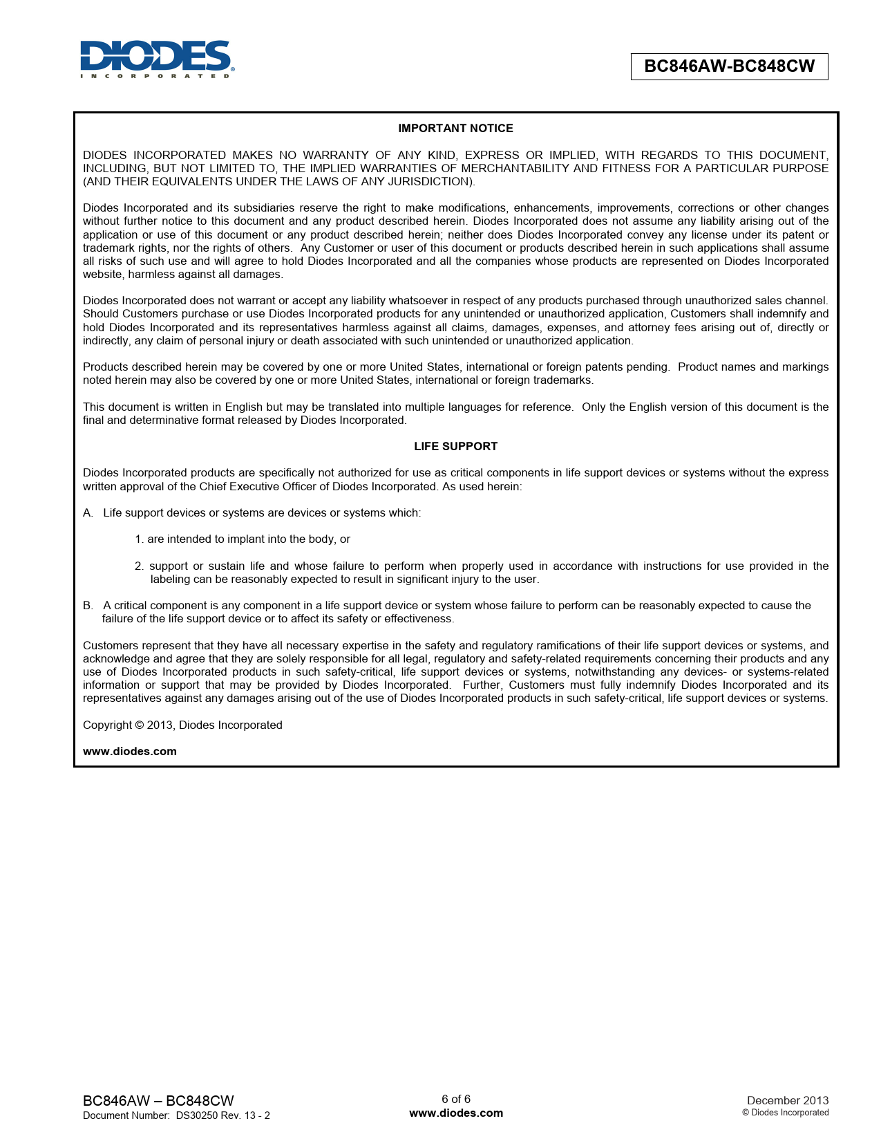 | Páginas / Página | 6 / 6 — BC846AW-BC848CW. IMPORTANT NOTICE. LIFE SUPPORT. www.diodes.com |