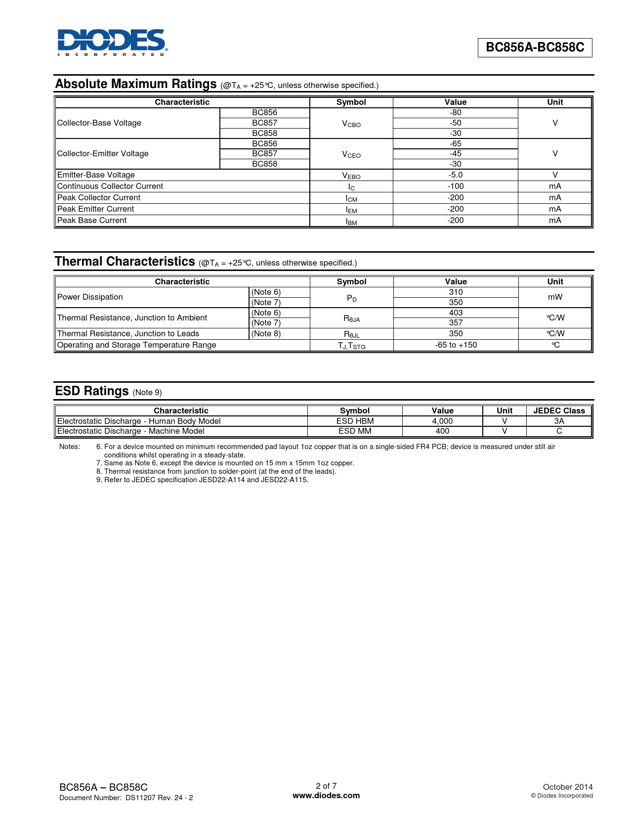 BC856A-BC858C. Absolute Maximum Ratings. Characteristic. Symbol. Value. Unit. Thermal Characteristics. ESD Ratings. JEDEC Class