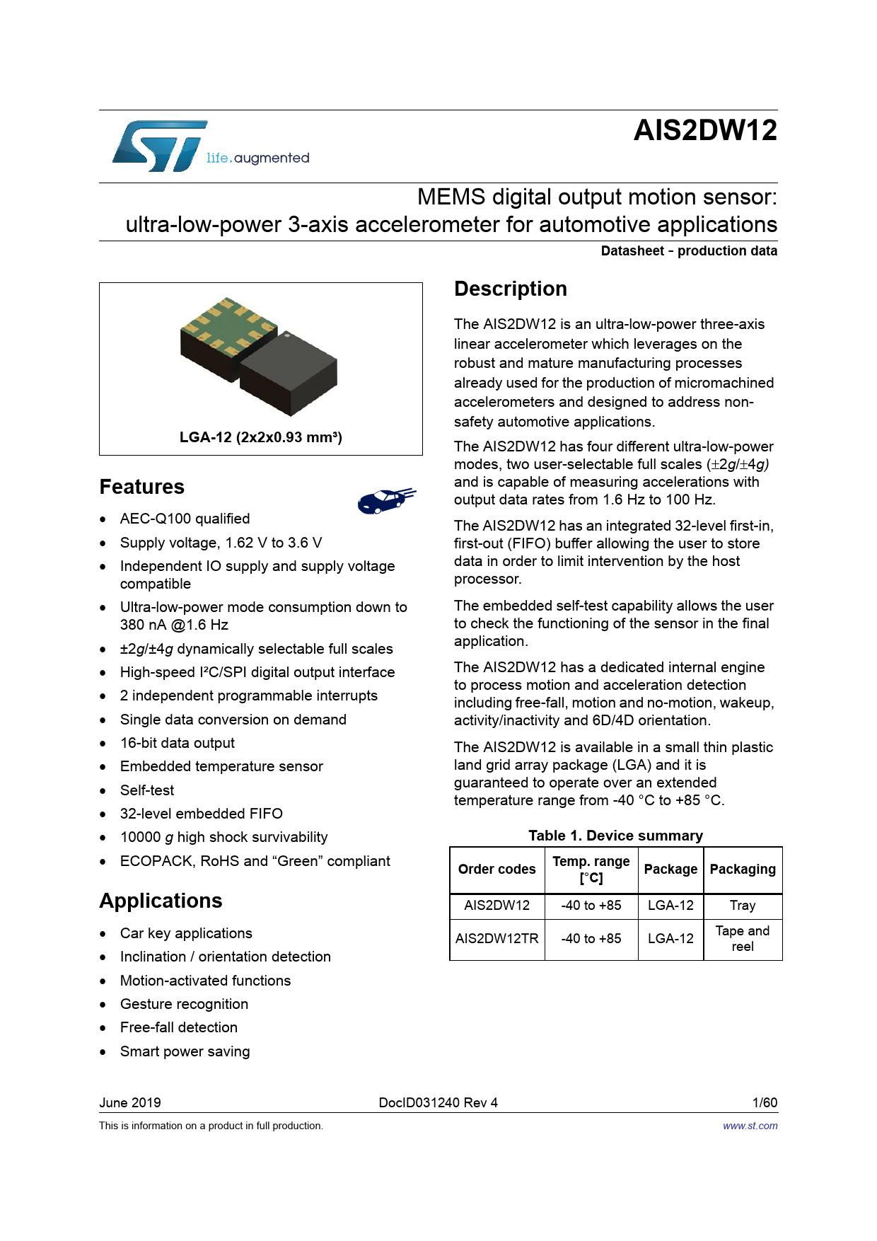 AIS2DW12. Datasheet. production data. Description. LGA-12 (2x2x0.93 mm³). Features. Table 1. Device summary. Temp. range. Order codes