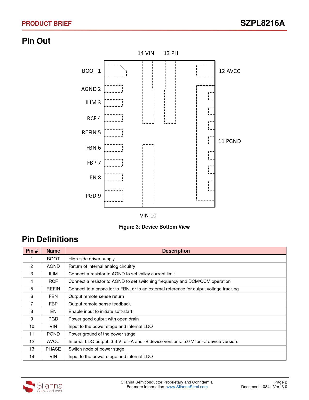 1 BOOT High-side driver supply 2 AGND Return of internal analog circuitry 3 ILIM Connect a resistor to AGND to set valley current limit 4 RCF Connect a resistor to AGND to set switching frequency and DCM/CCM operation 5 REFIN Connect to a capacitor to FBN, or to an external reference for output voltage tracking 6 FBN Output remote sense return 7 FBP Output remote sense feedback 8 EN Enable input to initiate soft-start 9 PGD Power good output with open drain 10 VIN Input to the power stage and internal LDO 11 PGND Power ground of the power stage 12 AVCC Internal LDO output. 3.3 V for -A and -B device versions. 5.0 V for -C device version. 13 PHASE Switch node of power stage 14 VIN Input to the power stage and internal LDO Silanna Semiconductor Proprietary and Confidential Page 2 For more information: www.SilannaSemi.com Document 10841 Ver. 3.0