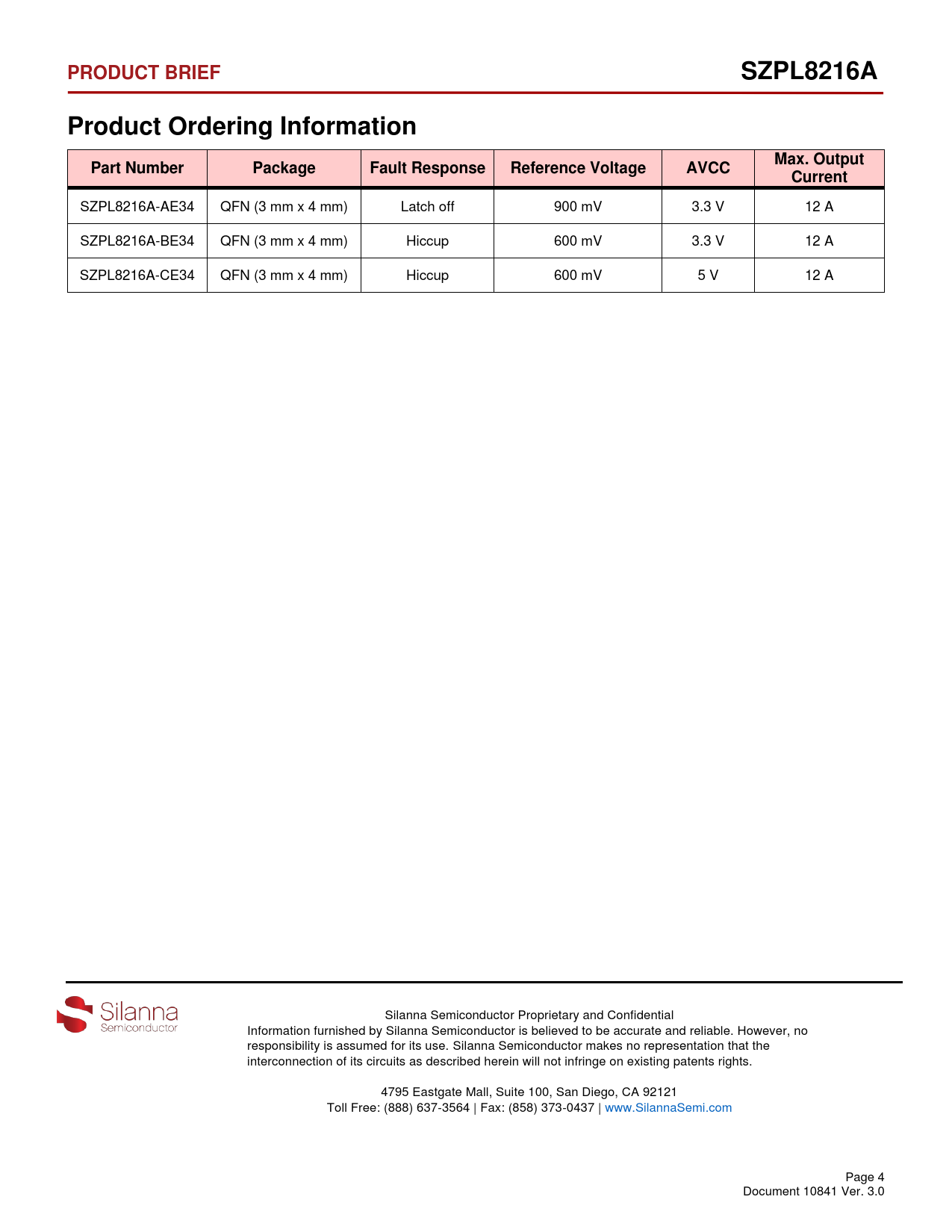 PRODUCT BRIEFSZPL8216AProduct Ordering InformationMax. OutputPart NumberPackageFault ResponseReference VoltageAVCCCurrent SZPL8216A-AE34 QFN (3 mm x 4 mm) Latch off 900 mV 3.3 V 12 A SZPL8216A-BE34 QFN (3 mm x 4 mm) Hiccup 600 mV 3.3 V 12 A SZPL8216A-CE34 QFN (3 mm x 4 mm) Hiccup 600 mV 5 V 12 A Silanna Semiconductor Proprietary and Confidential Information furnished by Silanna Semiconductor is believed to be accurate and reliable. However, no responsibility is assumed for its use. Silanna Semiconductor makes no representation that the interconnection of its circuits as described herein will not infringe on existing patents rights. 4795 Eastgate Mall, Suite 100, San Diego, CA 92121 Toll Free: (888) 637-3564 | Fax: (858) 373-0437 | www.SilannaSemi.com Page 4 Document 10841 Ver. 3.0