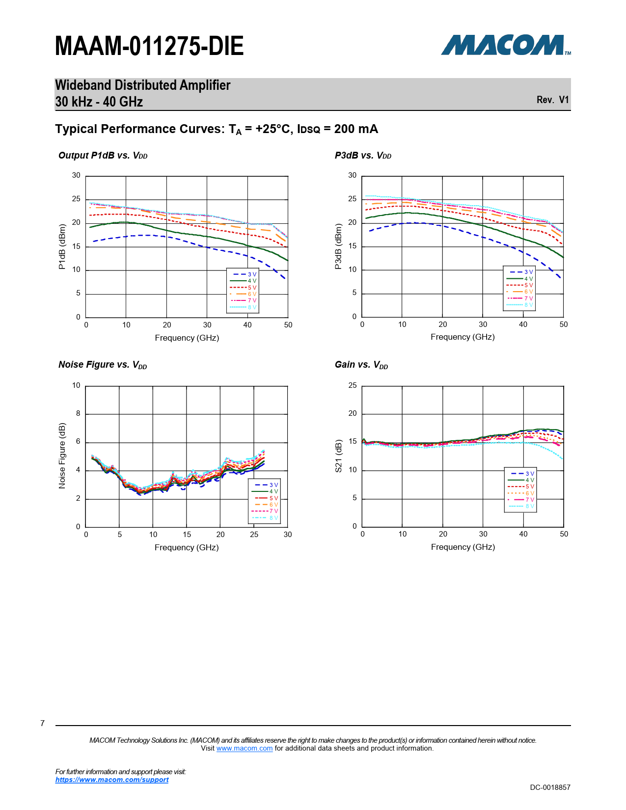 MAAM-011275-DIEWideband Distributed Amplifier30 kHz - 40 GHzRev. V1Typical Performance Curves: TA = +25°C, IDSQ = 200 mAOutput P1dB vs. VDDP3dB vs. VDD 30 30 25 25 20 ) 20 ) Bm (dBm d 15 ( 15 B B d 1d 3 P 10 P 10 3 V 3 V 4 V 4 V 5 V 5 V 5 6 V 5 6 V 7 V 7 V 8 V 8 V 0 0 0 10 20 30 40 50 0 10 20 30 40 50 Frequency (GHz) Frequency (GHz) Noise Figure vs. VDDGain vs. VDD 10 25 8 20 ) 6 e (dB 15 B) igur (d 1 F 2 4 S 10 3 V oise 4 V 3 V N 5 V 4 V 6 V 2 5 V 5 7 V 6 V 8 V 7 V 8 V 0 0 0 5 10 15 20 25 30 0 10 20 30 40 50 Frequency (GHz) Frequency (GHz) 7 MACOM Technology Solutions Inc. (MACOM) and its affiliates reserve the right to make changes to the product(s) or information contained herein without notice. Visit www.macom.com for additional data sheets and product information. For further information and support please visit: https://www.macom.com/support DC-0018857